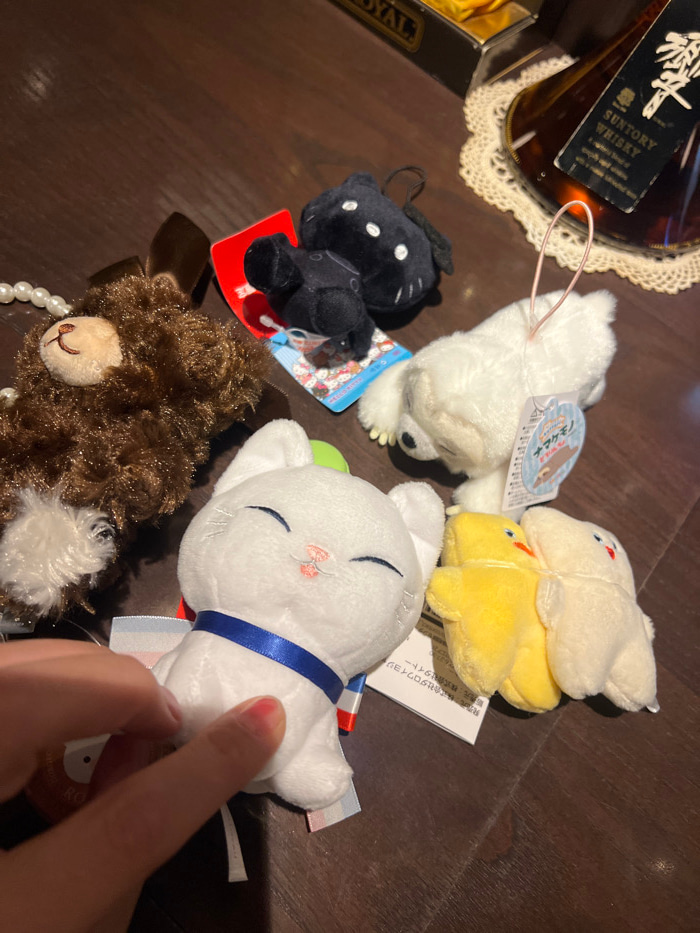 The image displays a top-down view of various small plush toys and keychains arranged on a polished dark brown wooden surface. In the foreground, a light-skinned human hand with pink-painted fingernai…read more