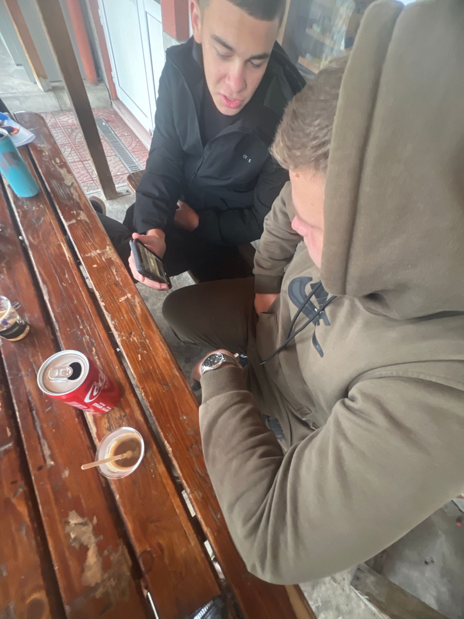 Two individuals are seated at a rustic wooden table. One person, wearing a black jacket, is holding a smartphone. The other, wearing a khaki-colored Nike hoodie with the hood up, is also seated at the…read more