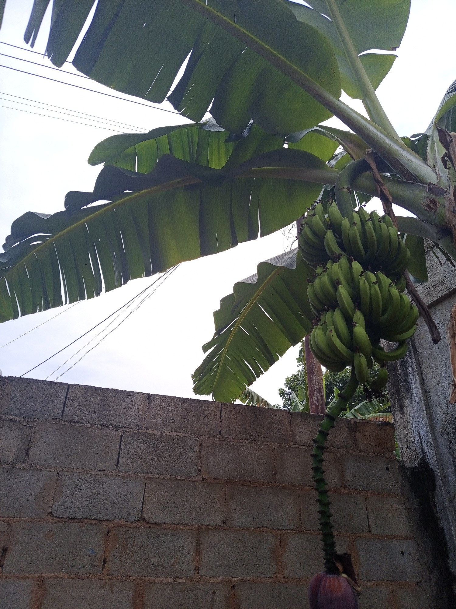 The image depicts a banana plant with a large bunch of green bananas hanging from it. A dark pink banana flower hangs below the bananas. The plant is growing next to a block wall and a concrete wall.…read more