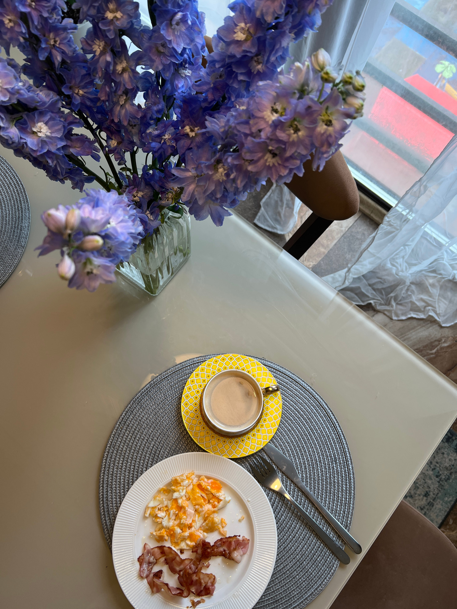 The image displays an overhead view of a breakfast setting on a light-colored, possibly glass, table in Khimki, Russia. To the left, a lush bouquet of purple flowers, likely Delphiniums, stands in a c…read more