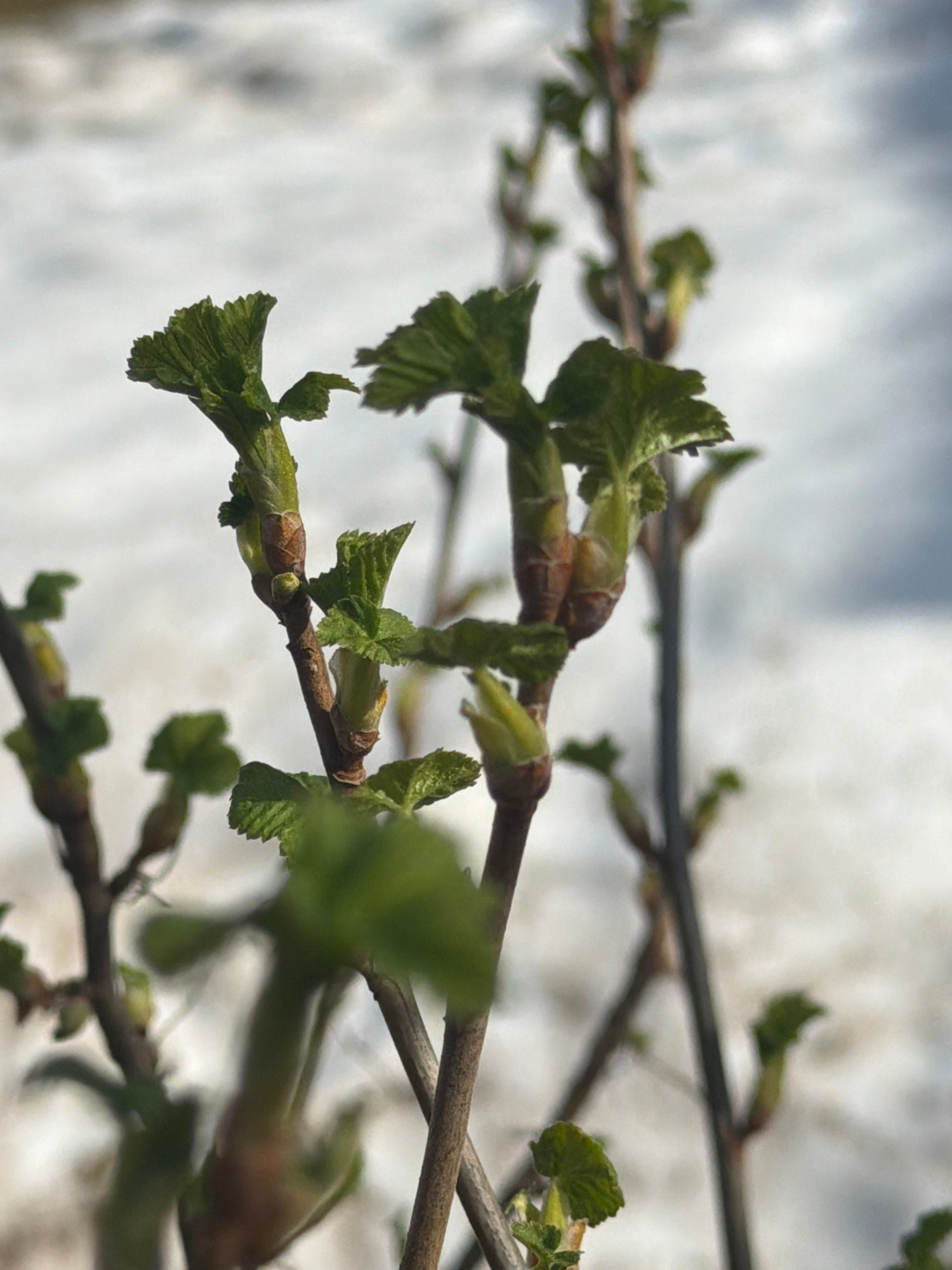 The image depicts close-up shots of budding branches, potentially from a tree or shrub, against a blurred background that may include snow or cloudy skies. The scene focuses on the early stages of lea…read more