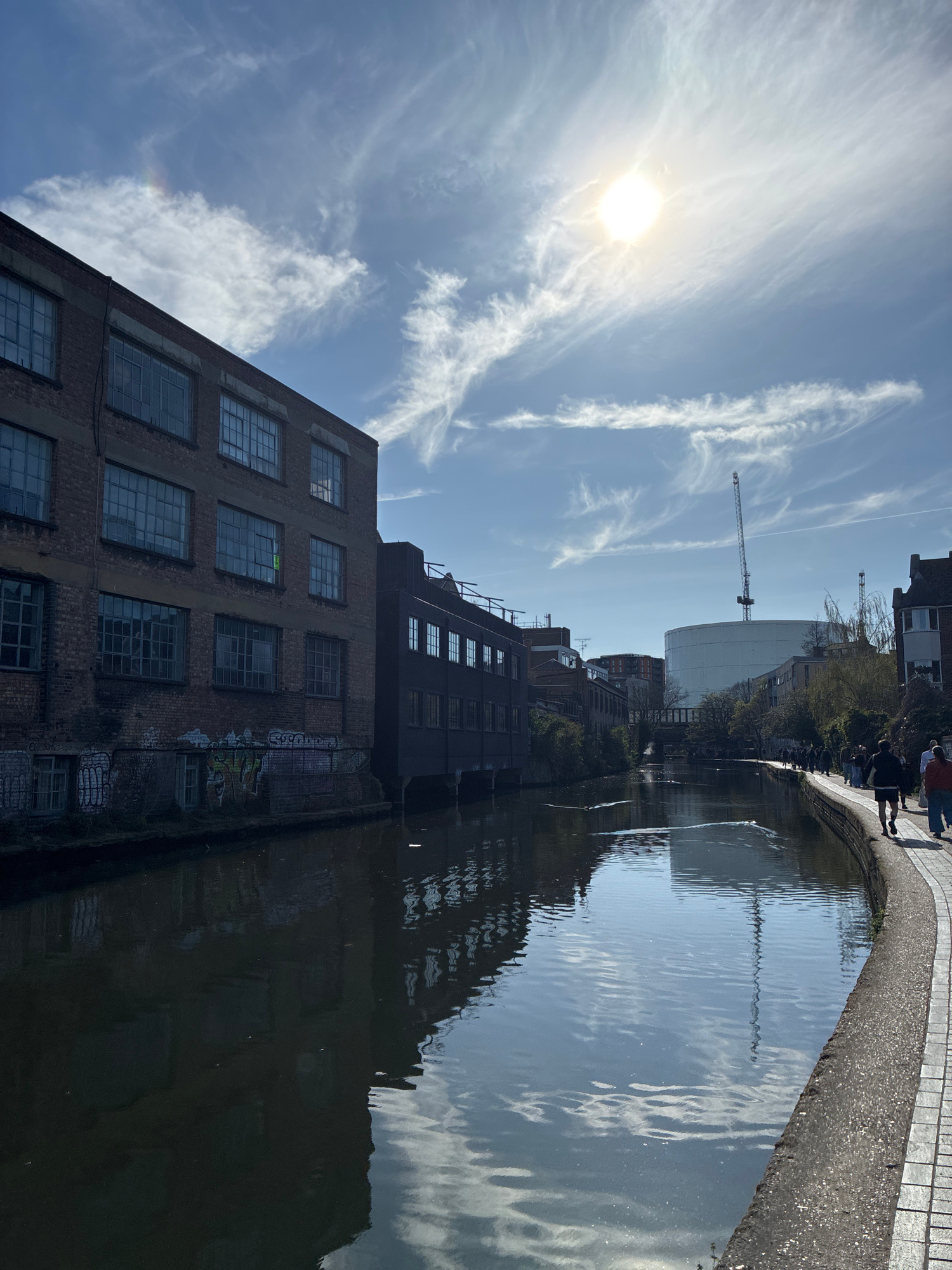The photograph depicts a canal in London, United Kingdom. On the bank of the canal, figures are seen walking. A brick building rises on one side, reflecting in the water. Graffiti marks a section of t…read more
