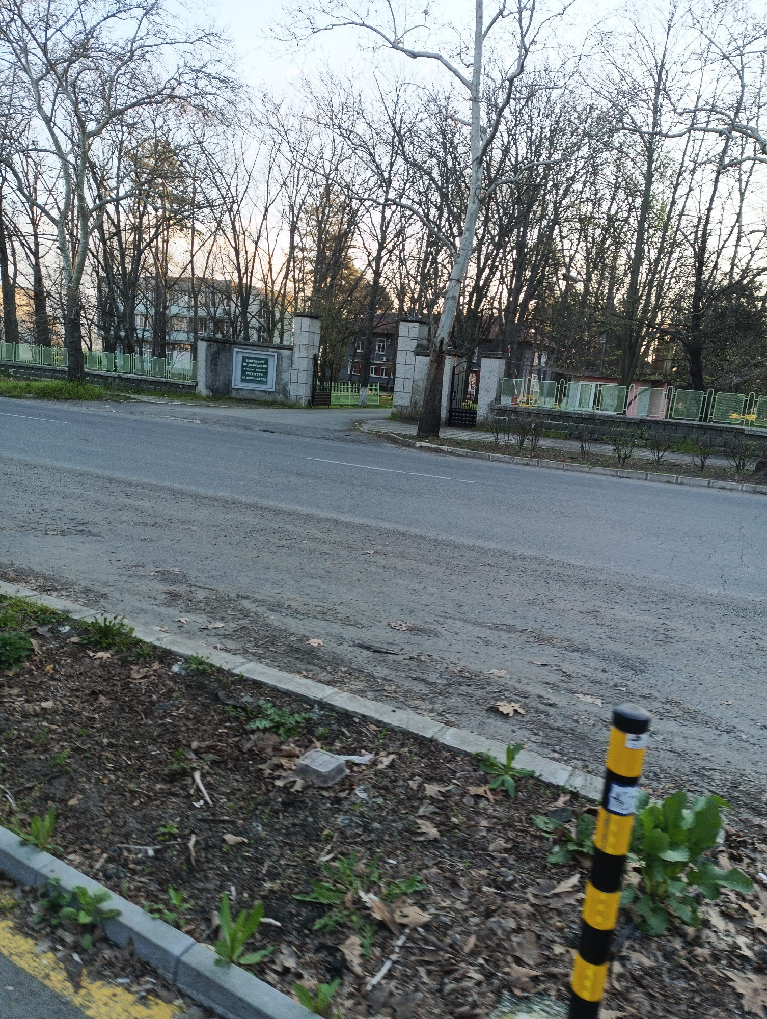 The image shows a street scene in Karnobat, Bulgaria. The street is paved and appears slightly worn. On the right side of the street, there is a safety bollard with alternating black and yellow stripe…read more