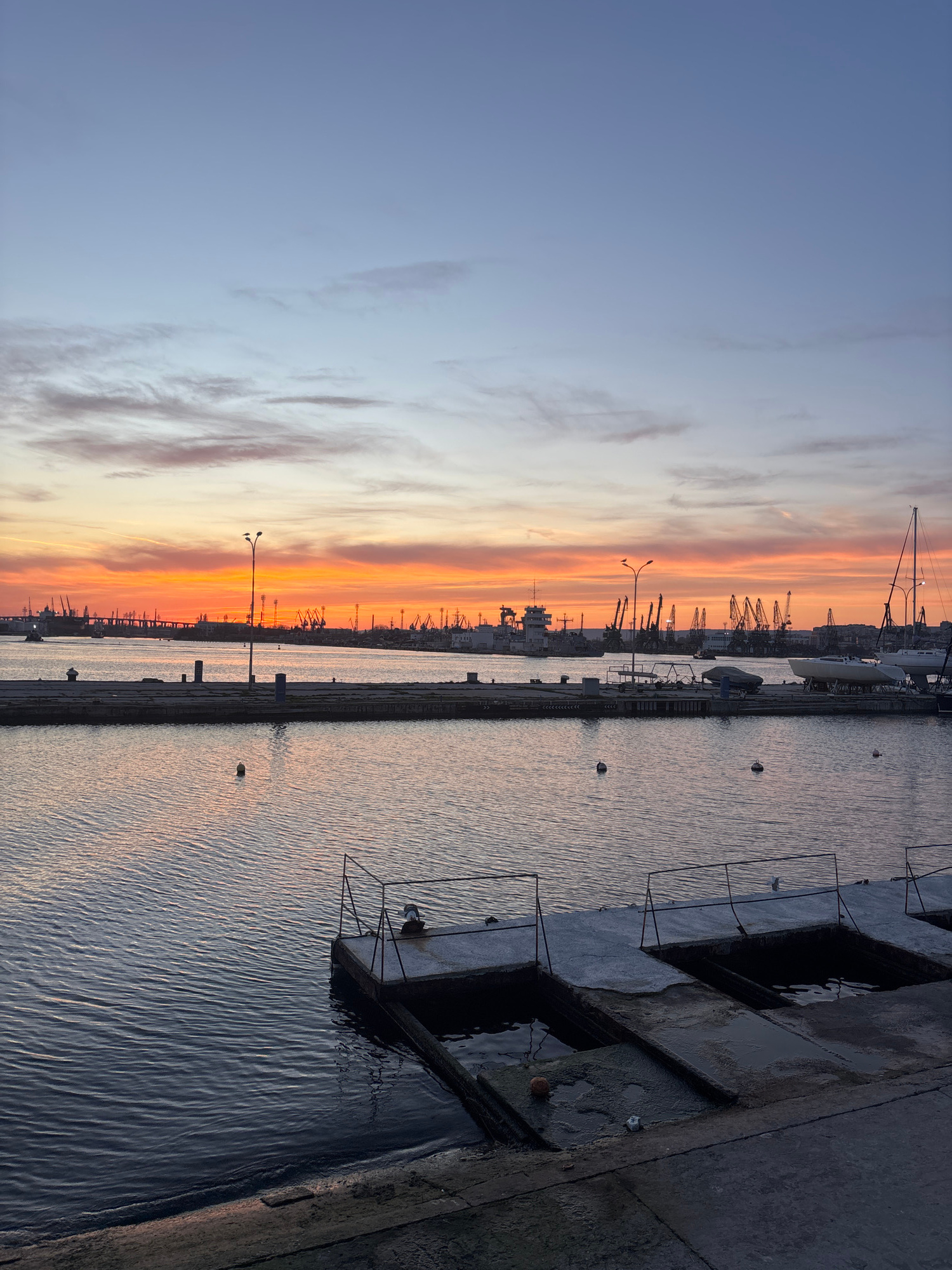 The image shows a waterfront scene at sunset. A body of water stretches across the frame, reflecting the colors of the sky. On the left side, the sky is a gradient of blue, fading into orange and red…read more