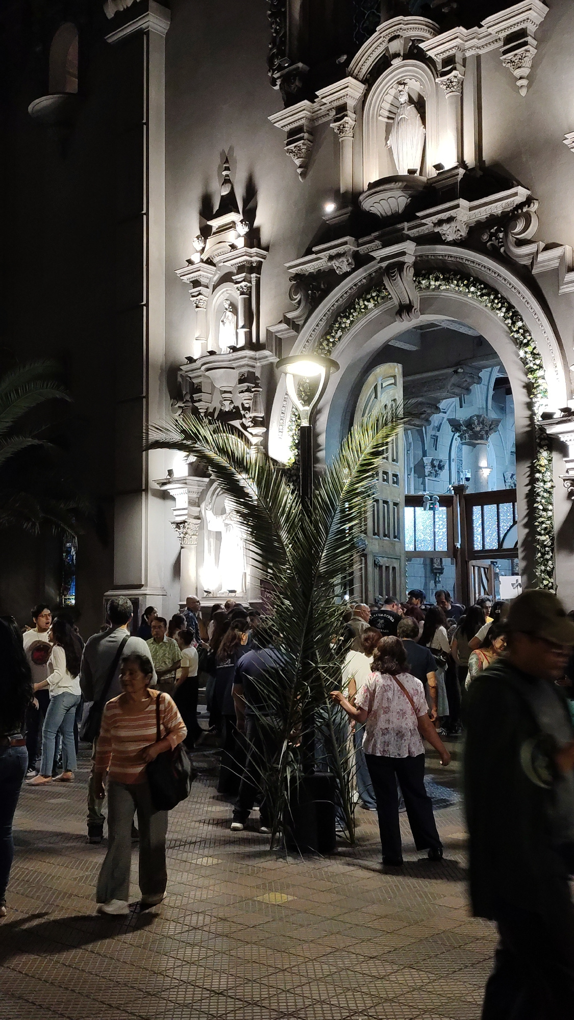 The image shows the facade of the Iglesia Matriz de Miraflores, a church in Miraflores, Peru, at night. A crowd of people is gathered near the entrance. A palm tree is in the foreground. The church'sā¦read more