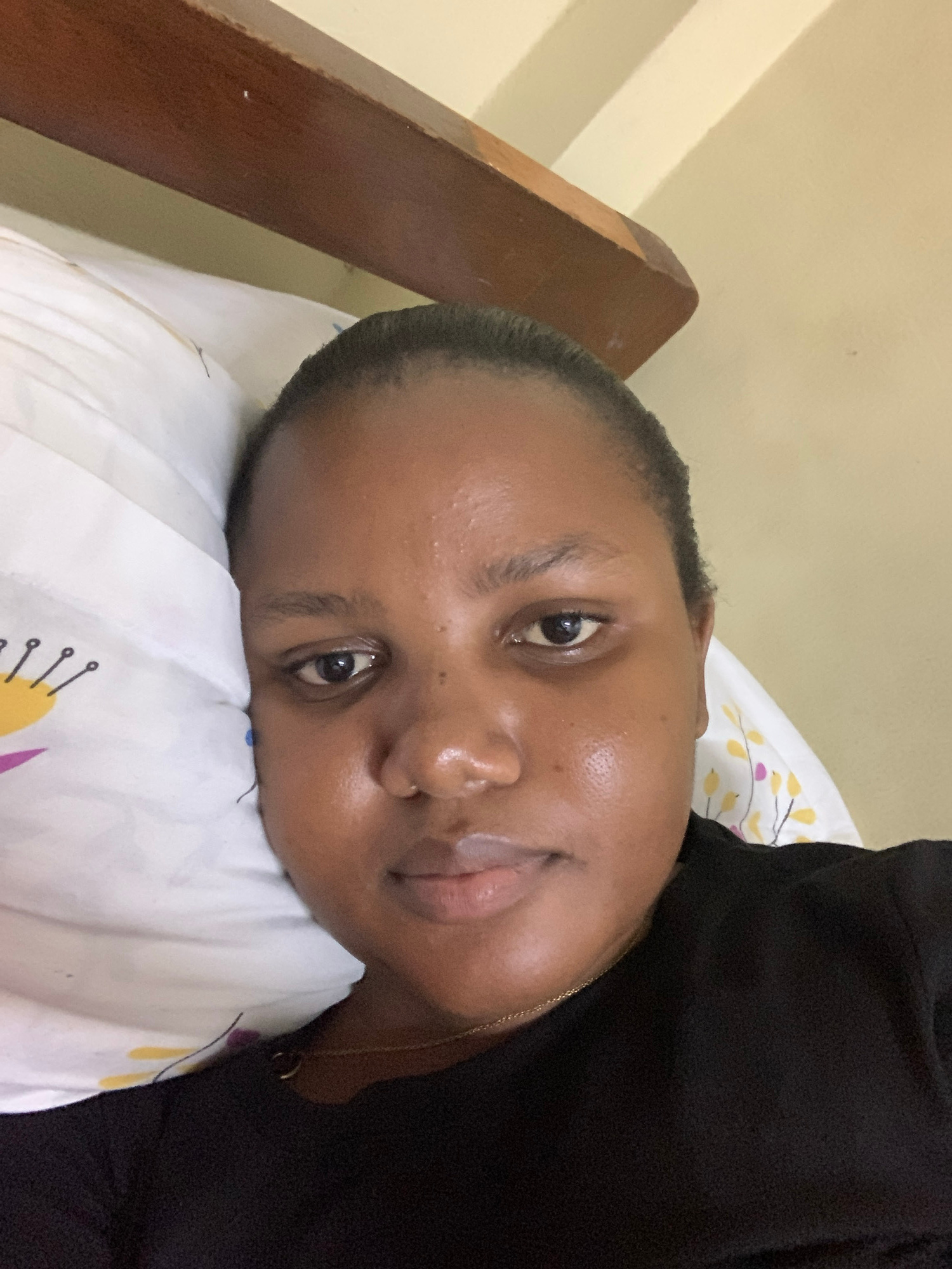 A medium shot depicts a woman lying on her side on a pillow with a patterned design, likely in a residential setting. Her head rests on the white pillow with yellow and purple floral-like patterns. Sh…read more