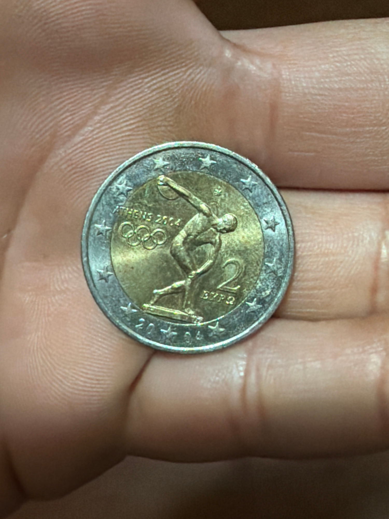 A 2 euro coin is held in a human hand. The coin commemorates the 2004 Athens Olympics. The edge of the coin has stars. The location is not determinable from the image.