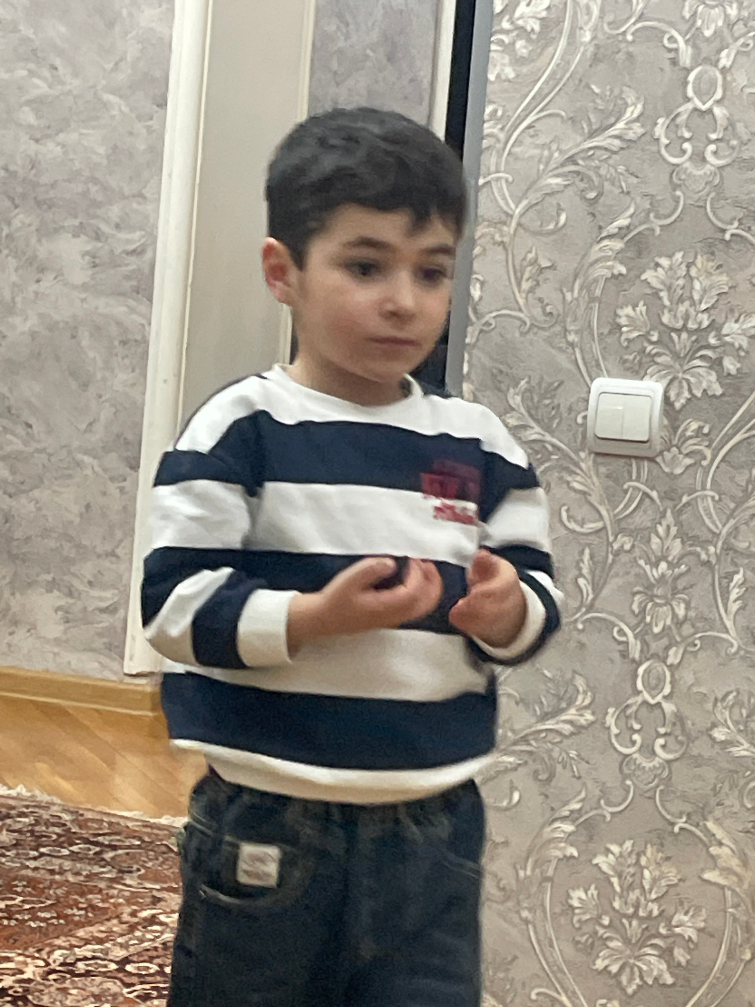 A boy stands indoors. He is wearing a striped shirt and jeans. The walls are patterned with floral designs. A light switch is on the wall behind him. Part of a rug is visible on the floor. No location…read more