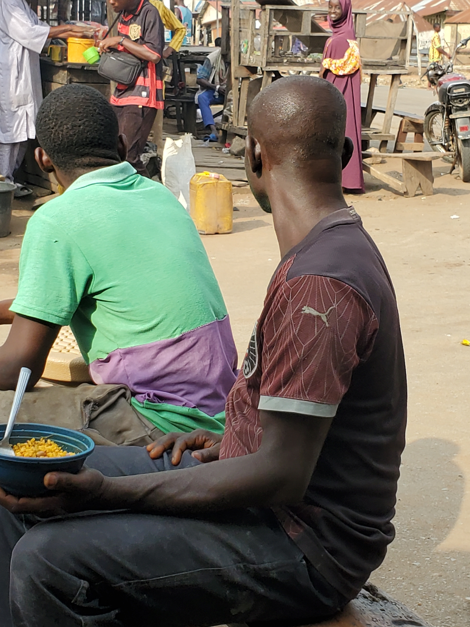 This media file captures a vibrant street scene in Mararaba, Nigeria, likely an outdoor market or a busy commercial area, under bright daylight. The ground appears to be dirt or sand. In the foregrou…read more
