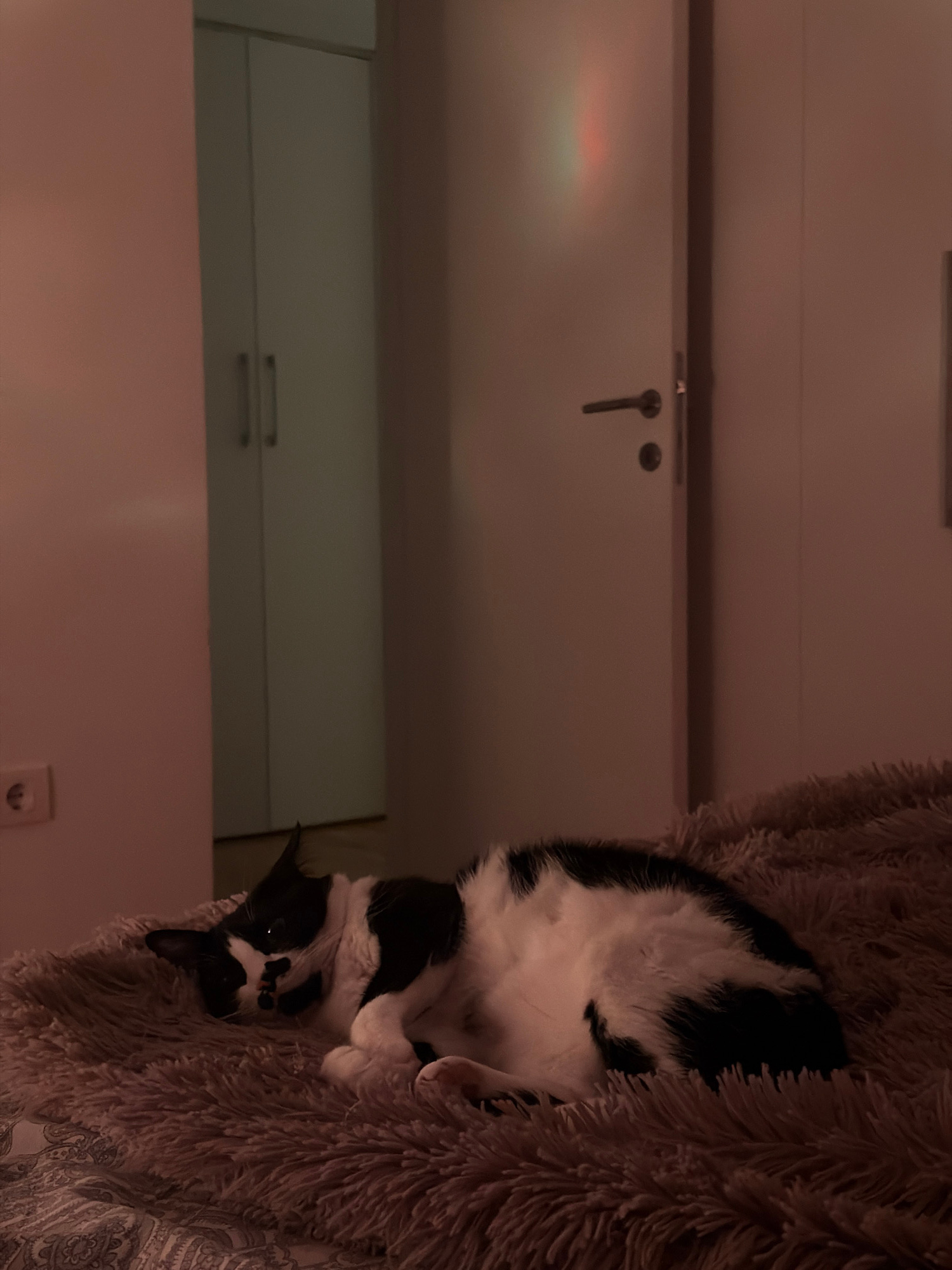 A black and white cat is nestled in a fluffy blanket. The cat is positioned in the upper right portion of the frame. A white cabinet with silver handles is in the background. Above the cabinet, a wall…read more