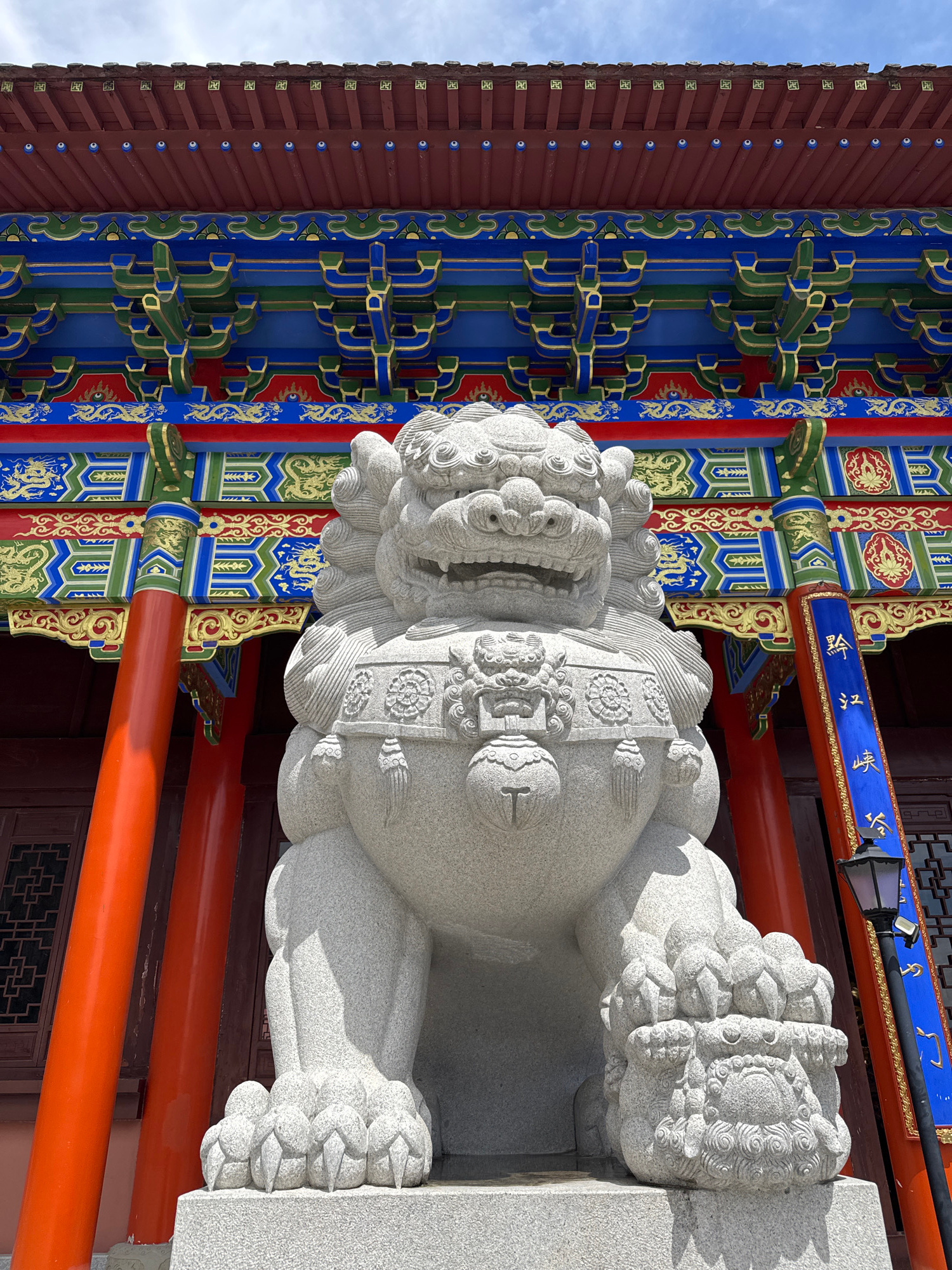 A stone lion statue stands prominently in Qianjiang, China, in front of a building adorned with traditional Chinese architectural elements. The lion, carved from light-colored stone, is captured in a…read more