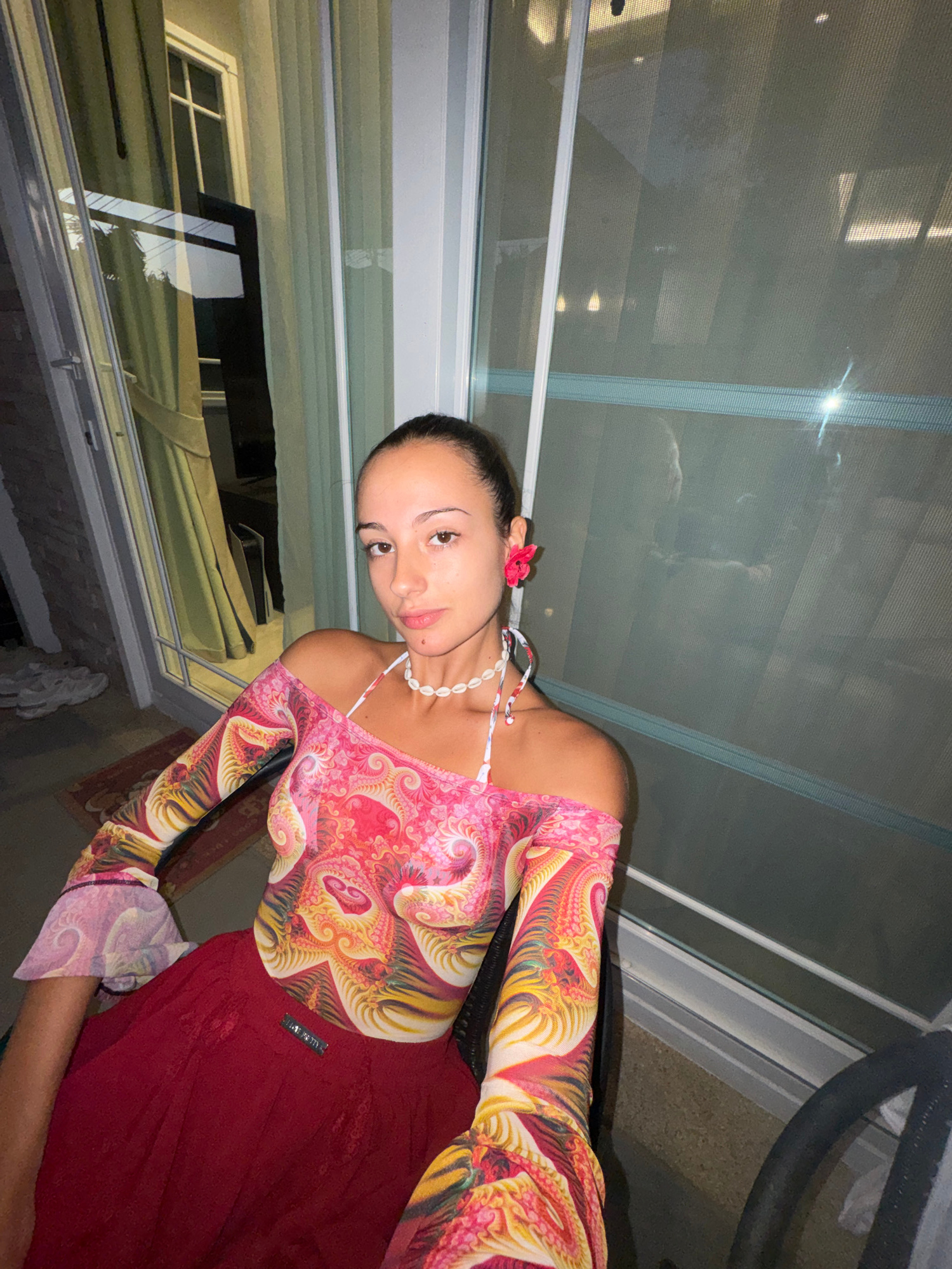 A woman poses indoors near a window, facing the camera at an angle. She has brown hair pulled back, fair skin, and wears a red flower in her hair, a shell necklace, and a pink and yellow long-sleeved…read more