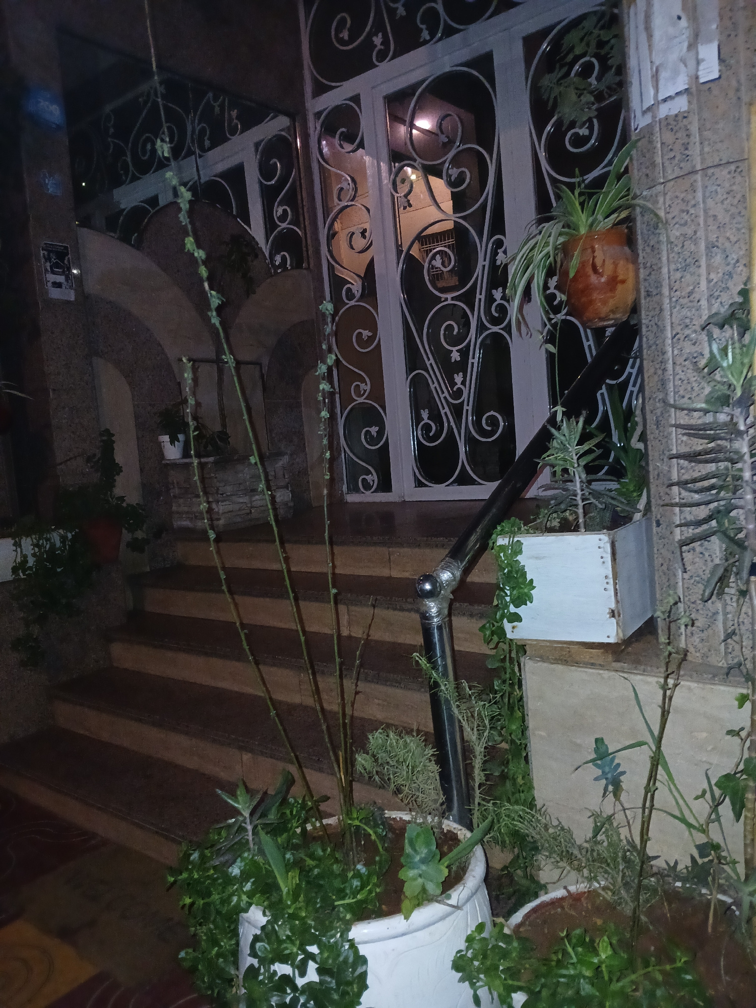 The image shows a doorway area in Meknes, Morocco. The doorway has a wrought iron gate with decorative scrollwork. A plant in a terracotta pot is affixed to the gate. A white wooden box is mounted on…read more