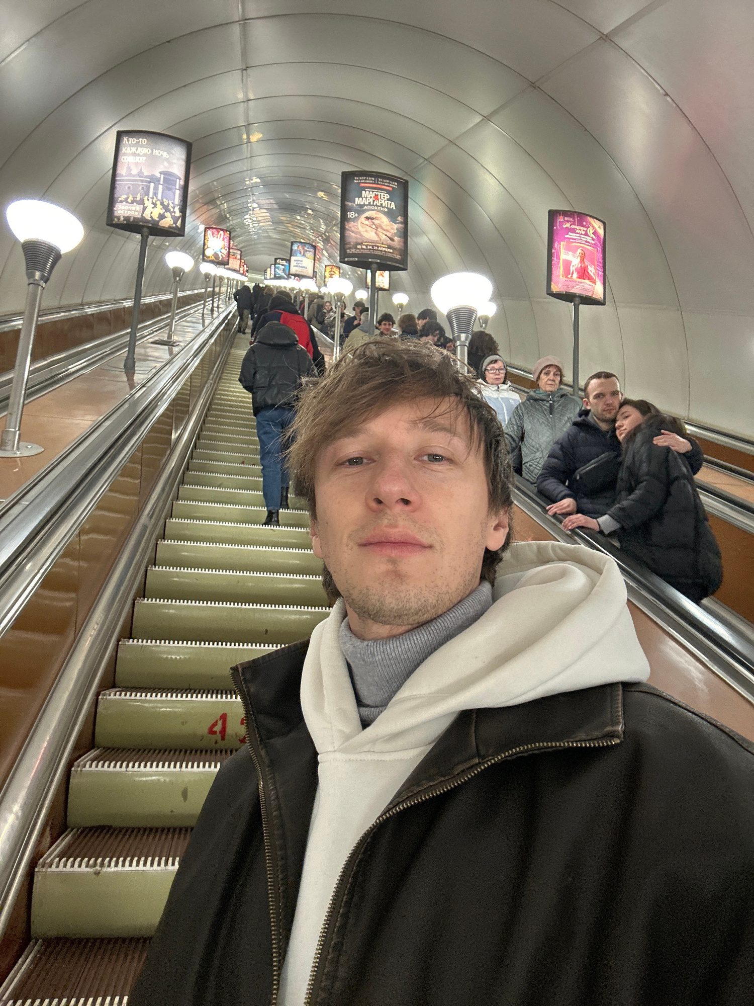 The image shows a man taking a selfie on an escalator in what appears to be a subway station in Saint Petersburg, Russia. He is wearing a dark jacket over a white hoodie and a gray sweater. Several ot…read more