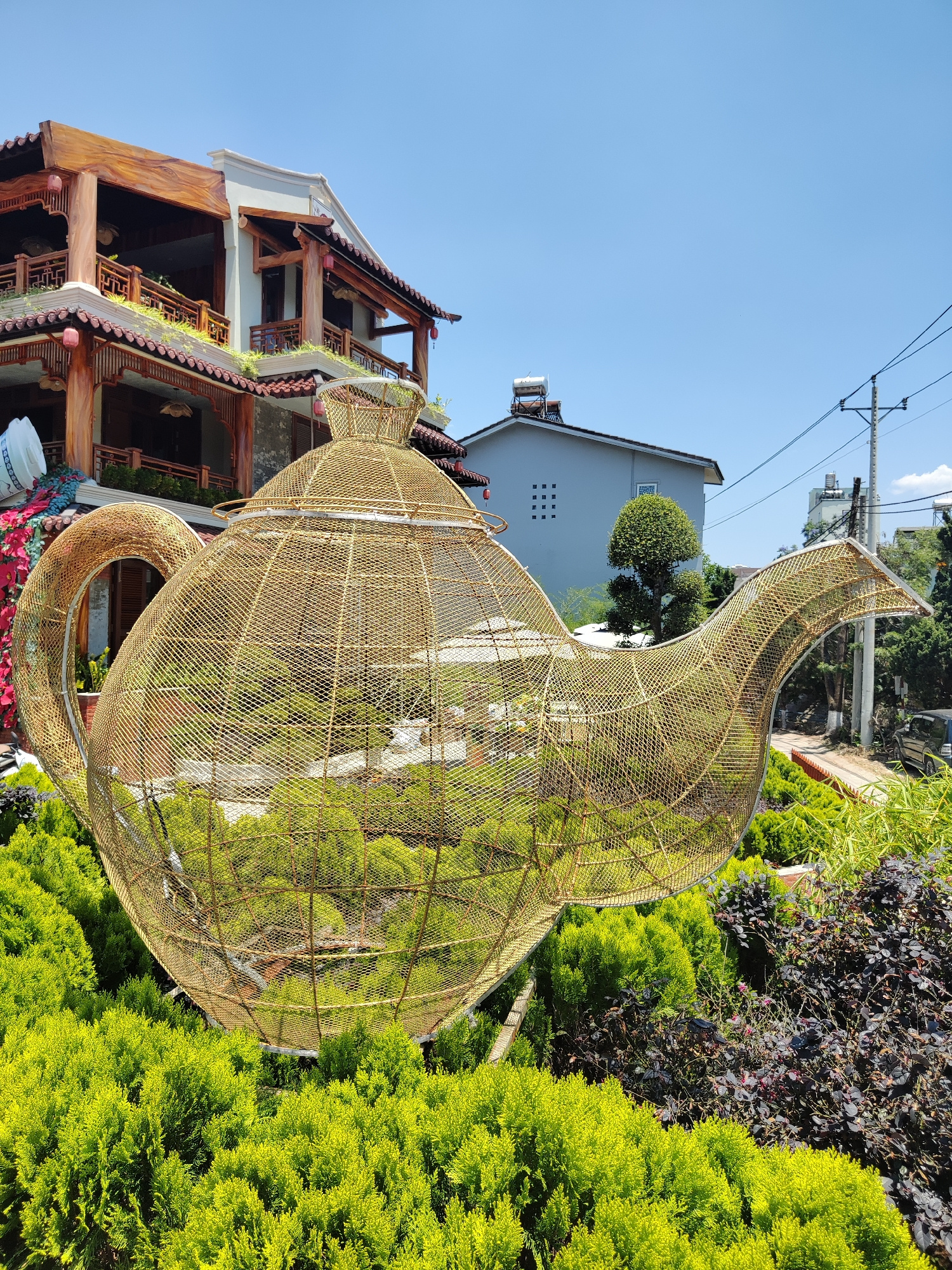 The image showcases a large, golden, wireframe sculpture of a teapot in Da Lat, Vietnam. The teapot is set amidst a lush garden of small, green, spherical bushes and some dark purple foliage. The wire…read more