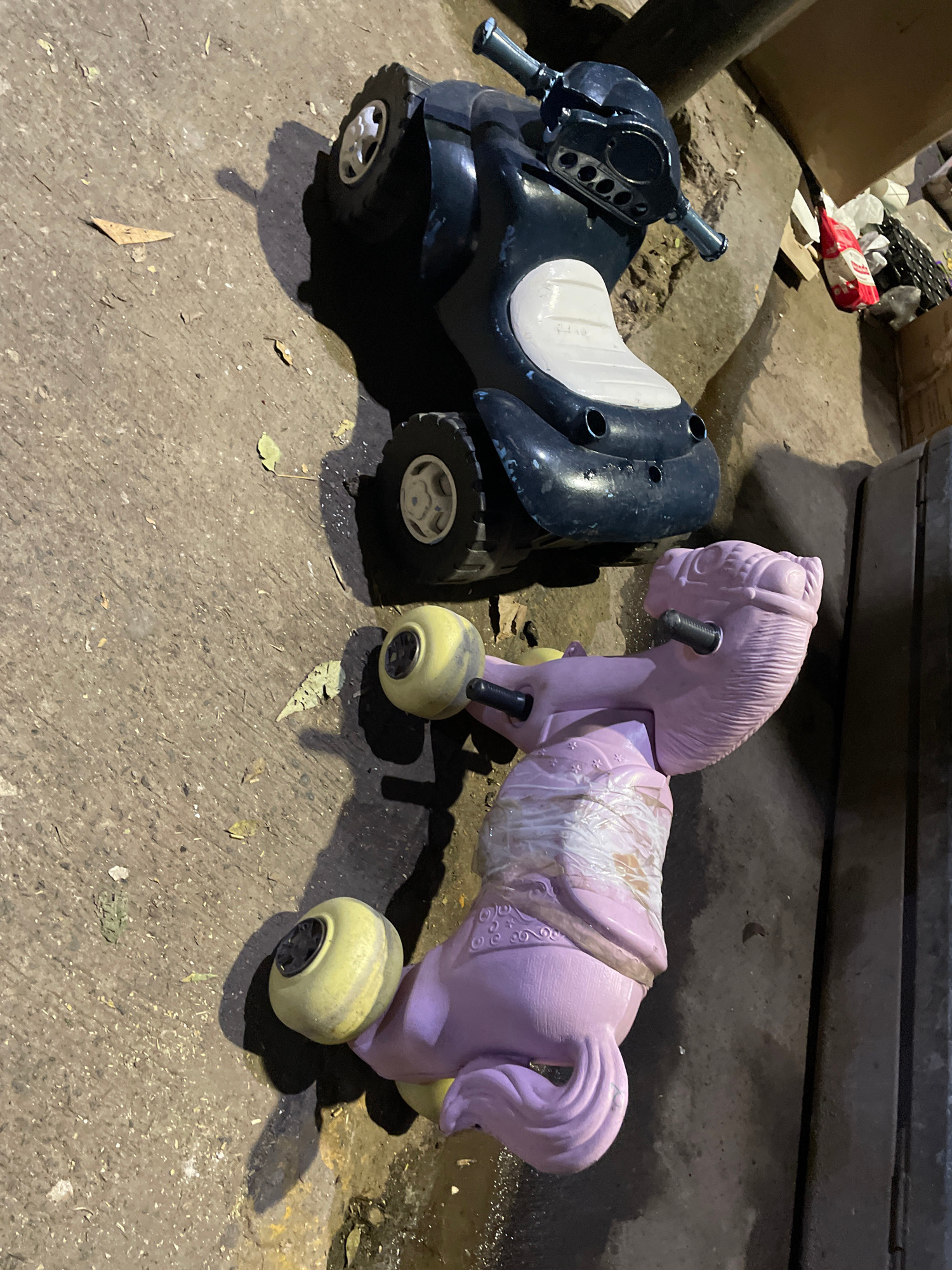 The image depicts two children's ride-on toys on a concrete surface. On the left is a black four-wheeled ATV-style vehicle with a white seat. To the right is a pink horse-shaped toy with four yellow w…read more
