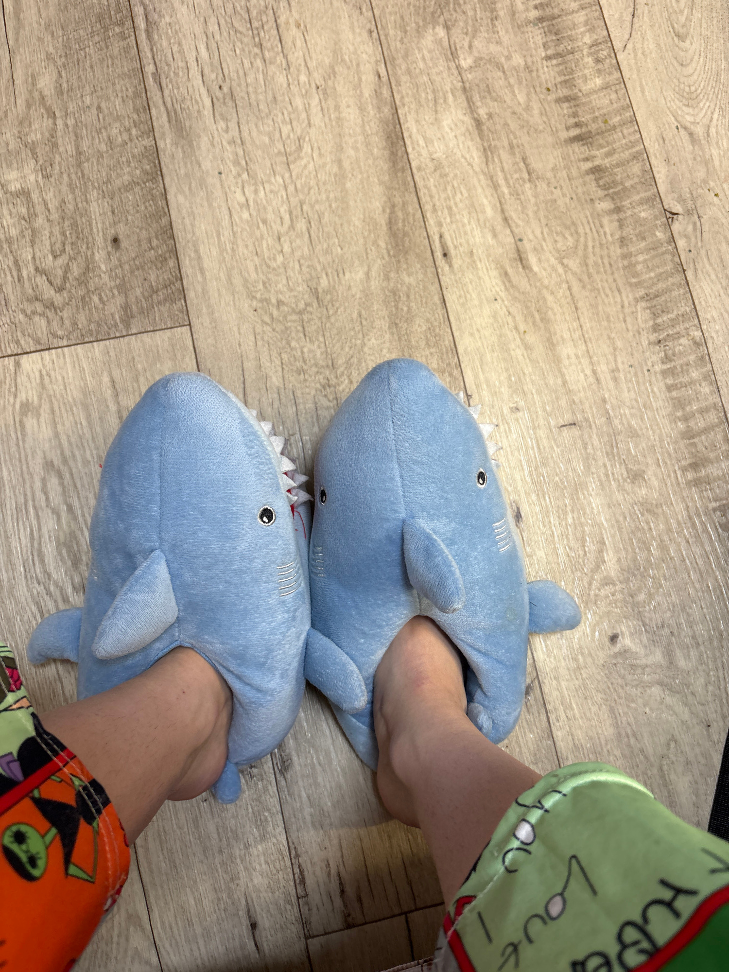A top-down view shows two feet wearing light blue, plush shark slippers on a light brown, wood-look floor. The left foot is encased in a slipper, with the shark's teeth, eyes, and fins visible. Simila…read more