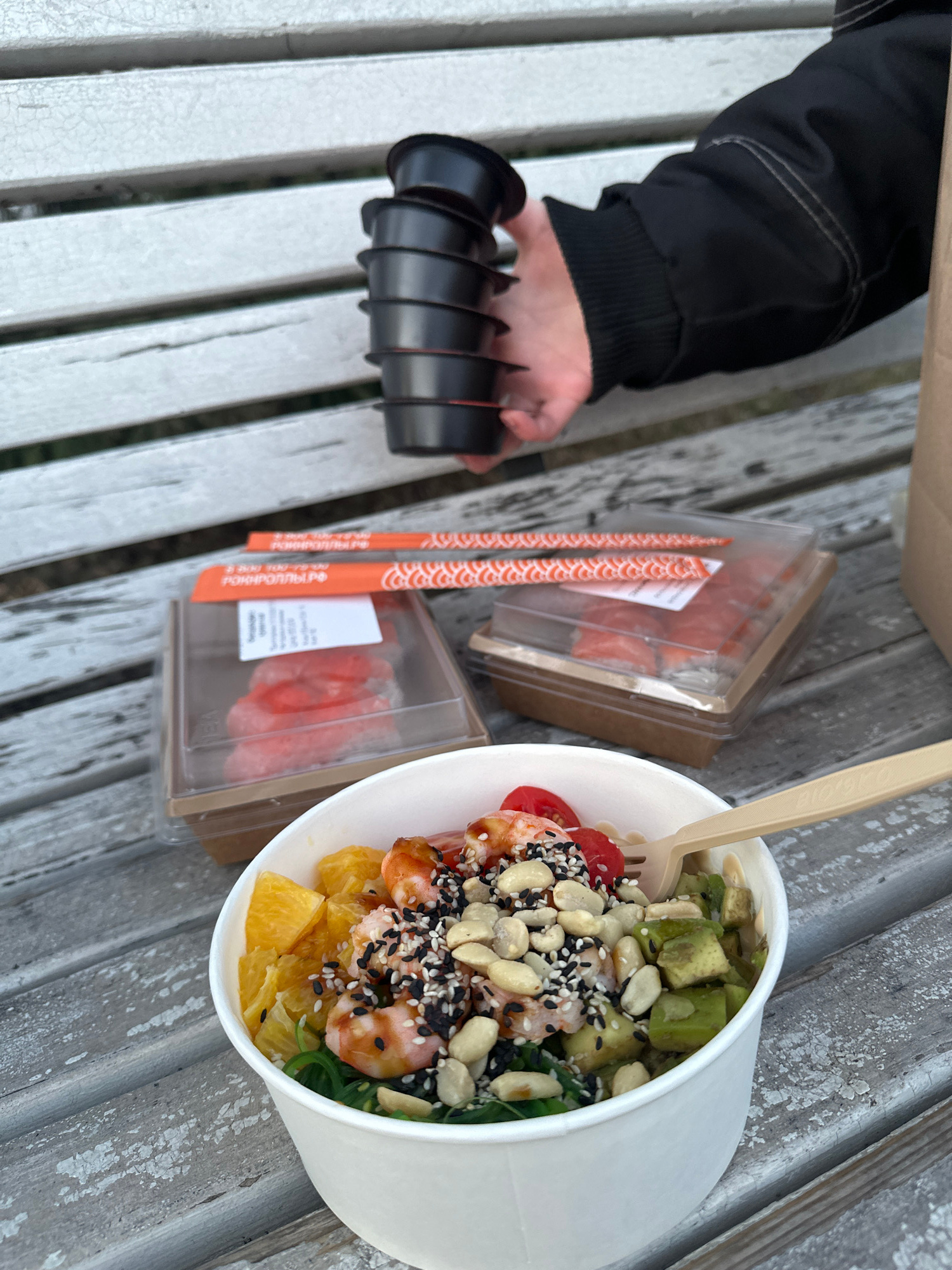 On a weathered wooden bench in Kazan, Russia, lies a takeout meal. To the right, a white bowl brimming with avocado, tomatoes, shrimp, oranges, and sesame seeds. Next to it are two translucent contain…read more