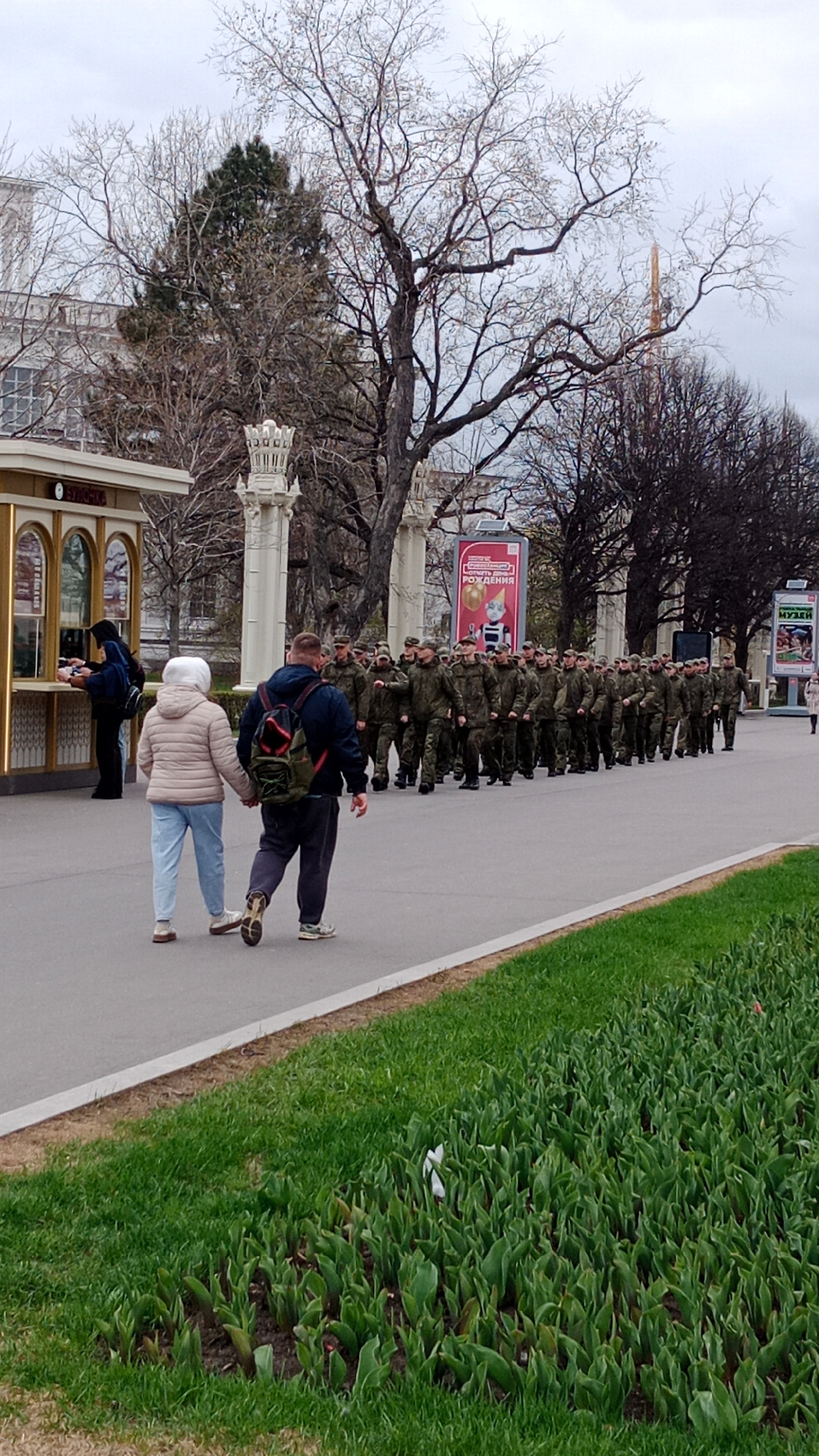 A military parade is underway in Moscow, Russia. A line of soldiers dressed in green camouflage uniforms march in formation along a paved path. Beside the path, an older couple walks hand-in-hand, see…read more