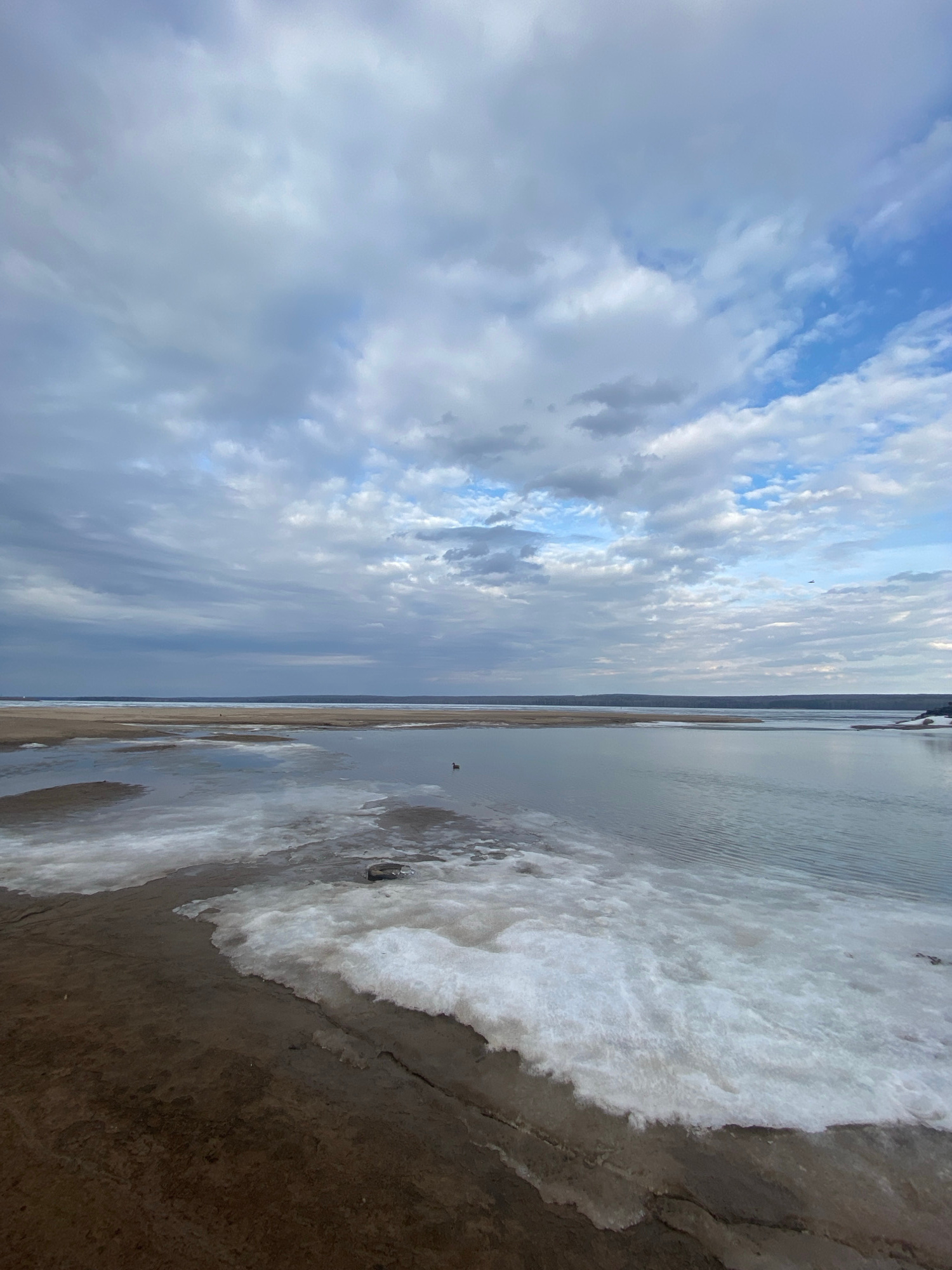 The image, viewed in its correct orientation (rotated 90 degrees counter-clockwise), presents a vast, open landscape composed primarily of sky, water, and shoreline. **Subjects:** The upper half of t…read more