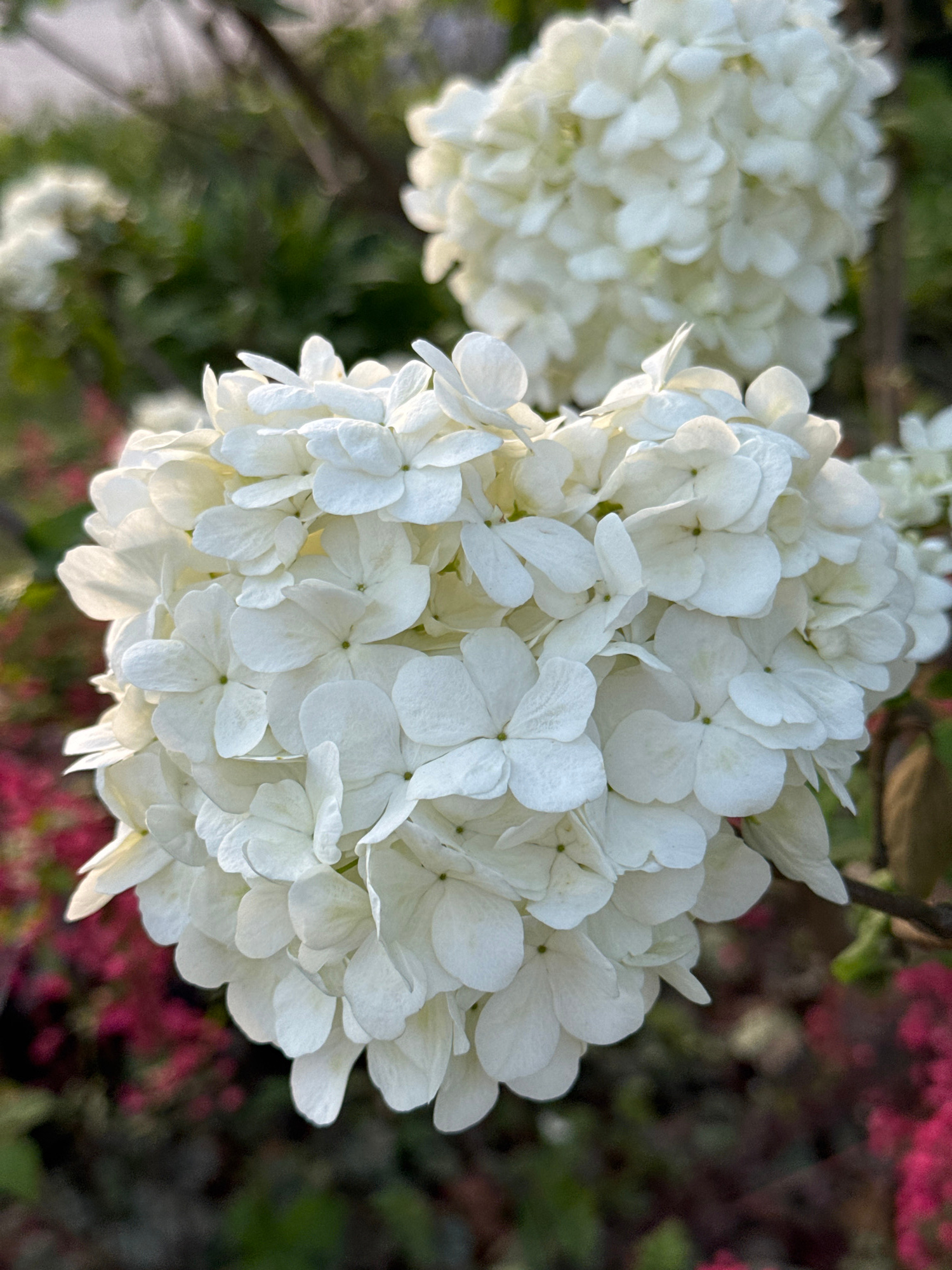 The image shows a close-up of two snowball bush (Viburnum opulus 'Roseum') flower clusters. The flowers are white, globular, and densely packed with individual blossoms. The cluster on the right is in…read more