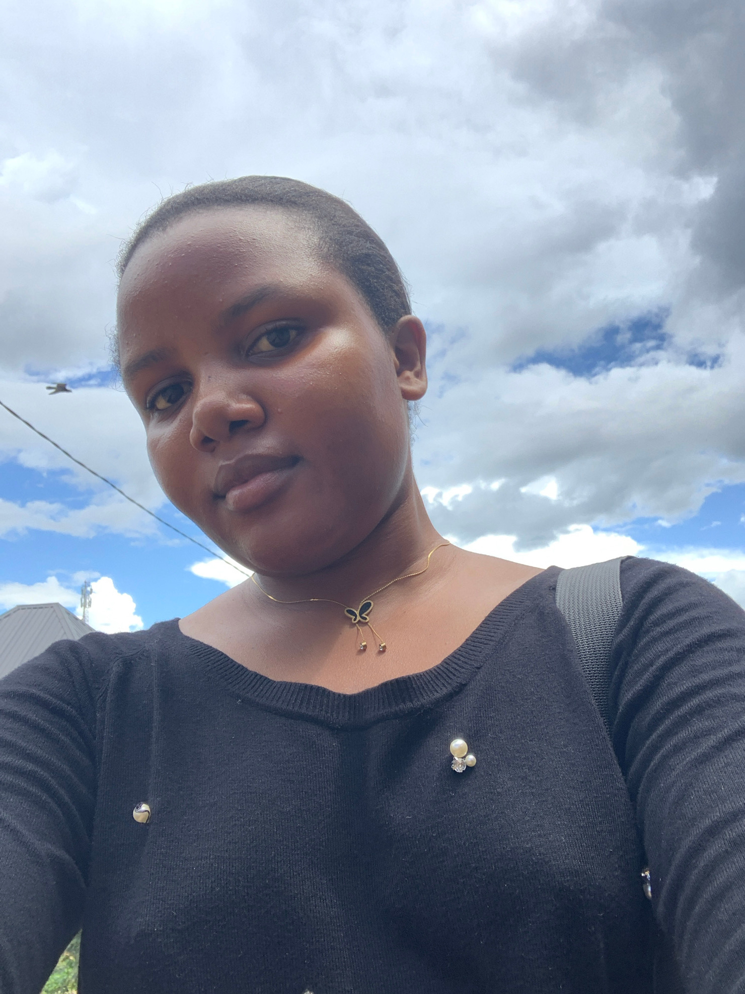 An outdoor, upward-angled portrait depicts a female individual with dark brown skin and short, dark hair, looking directly at the camera with a neutral expression. She wears a black long-sleeved knitt…read more