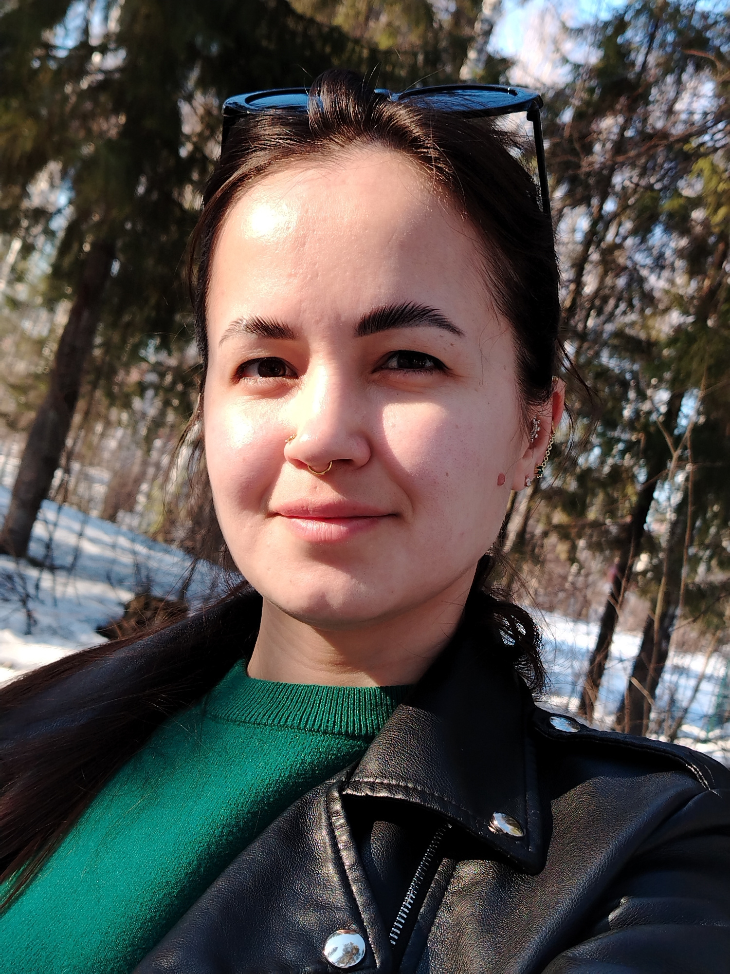 A woman is taking a selfie outdoors in what appears to be a wooded area. She is wearing a green sweater under a black leather jacket. Her dark hair is pulled back. She has a nose ring and multiple earβ¦read more