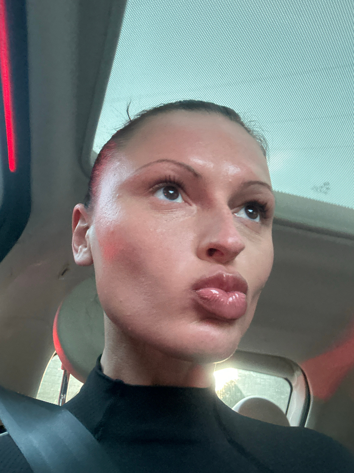 A female individual is depicted in a vehicle interior, seen from the chest up. She wears a dark, high-necked garment and a grey seatbelt across her left shoulder. Her hair is pulled back, revealing a…read more