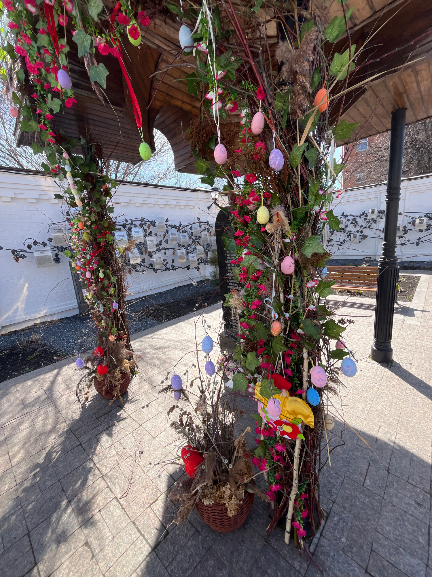 This image captures an outdoor scene in Ulyanovsk, Russia, adorned with festive spring or Easter decorations. The primary subjects are two large, elaborate decorative arrangements resembling "Easter t…read more