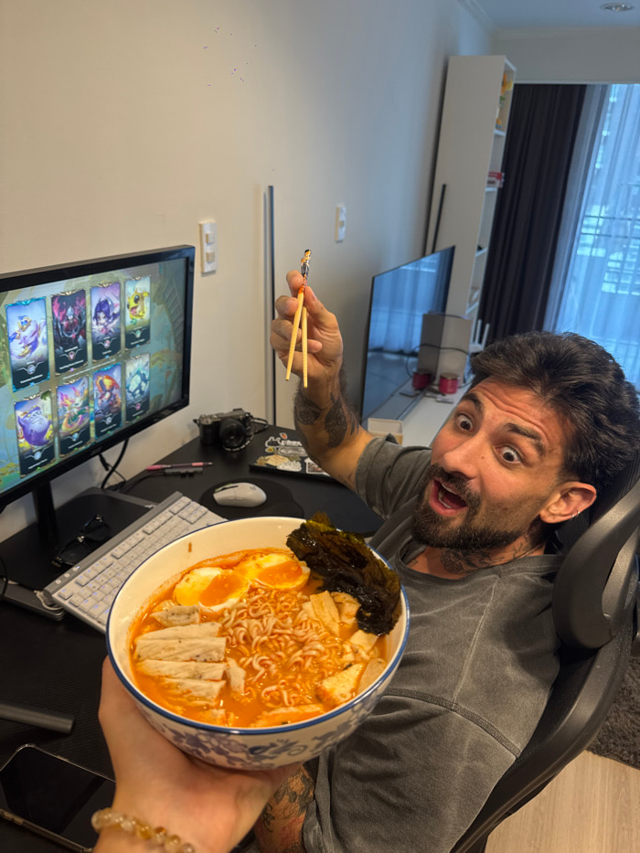 The scene depicts an indoor setting within a modern apartment in Bangkok, Thailand. A male individual, appearing to be in his 30s or 40s, with dark hair, a beard, and extensive visible tattoos on his…read more
