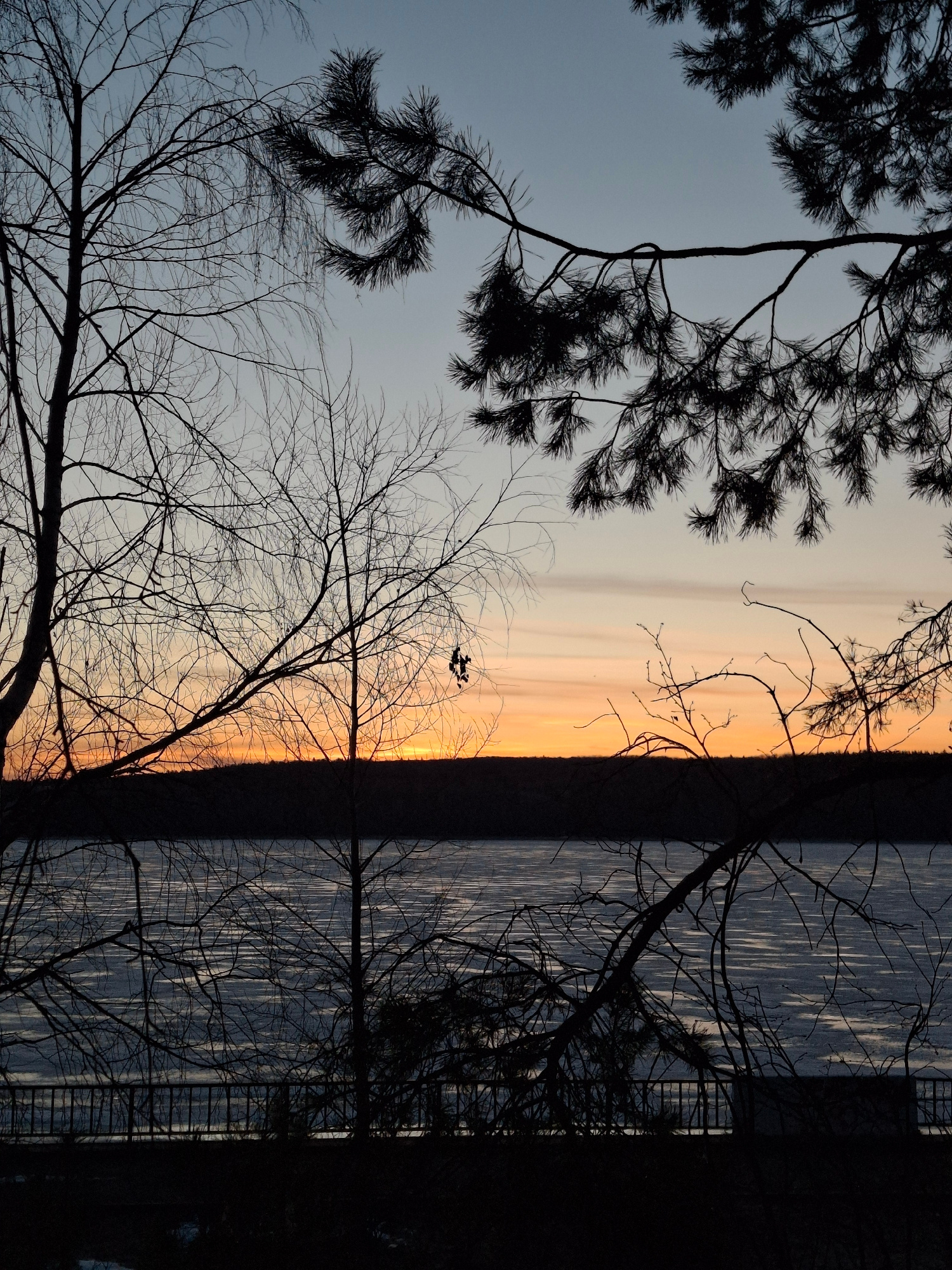 The image depicts a serene natural landscape at either sunrise or sunset, characterized by vibrant sky colors and silhouetted trees overlooking a body of water. The sky transitions from a soft, pale b…read more