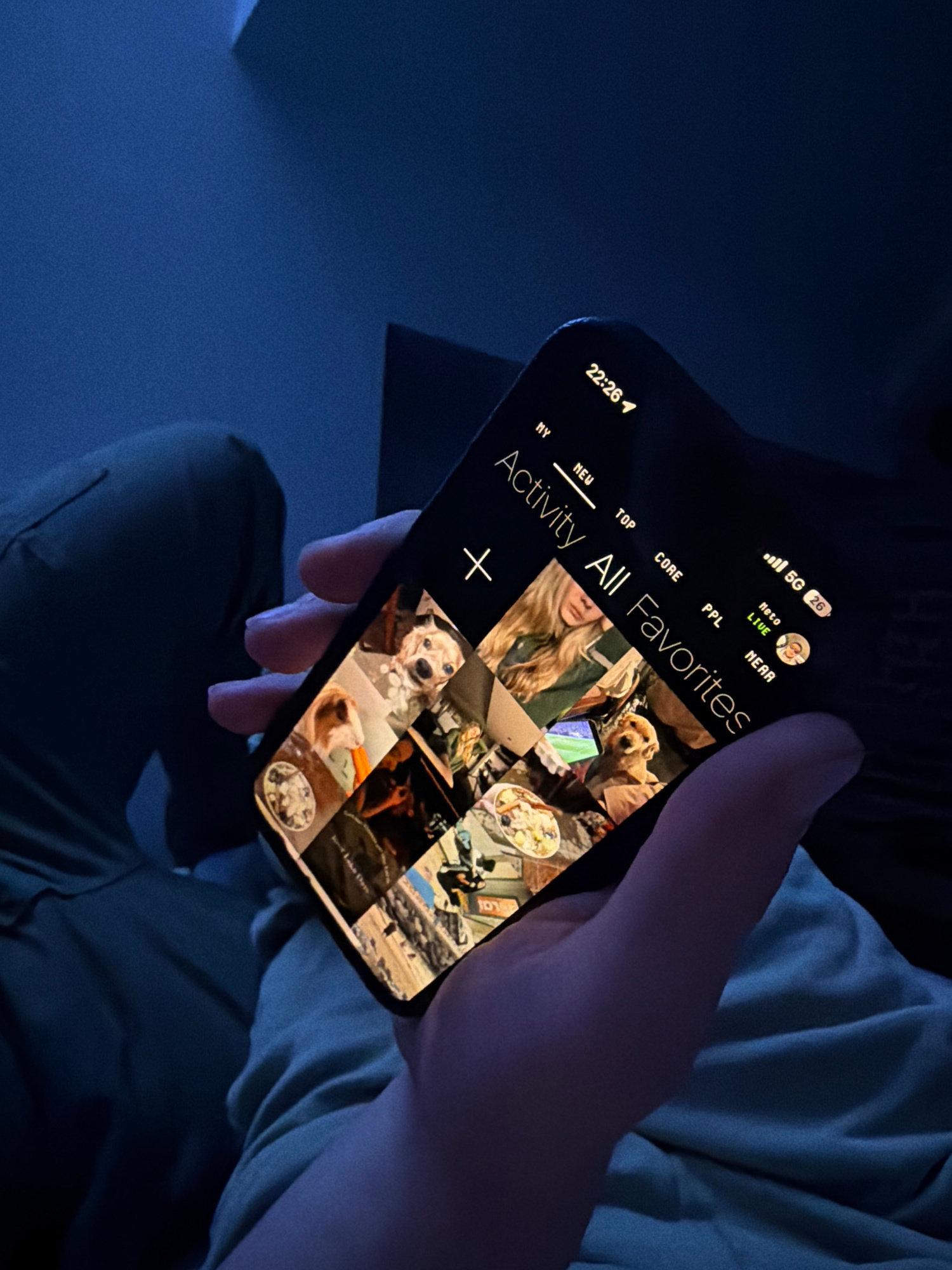 A person is holding a black iPhone in their left hand, displaying an app screen labeled "Activity All Favorites" with a mosaic of photos. The phone's status bar shows "22:26," "5G," "26," and other inβ¦read more