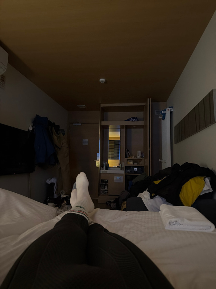 A first-person perspective captures the lower legs and feet of an individual resting on a white bed within a dimly lit hotel room located in Kutchan, Japan. The individual wears black leggings and whi…read more