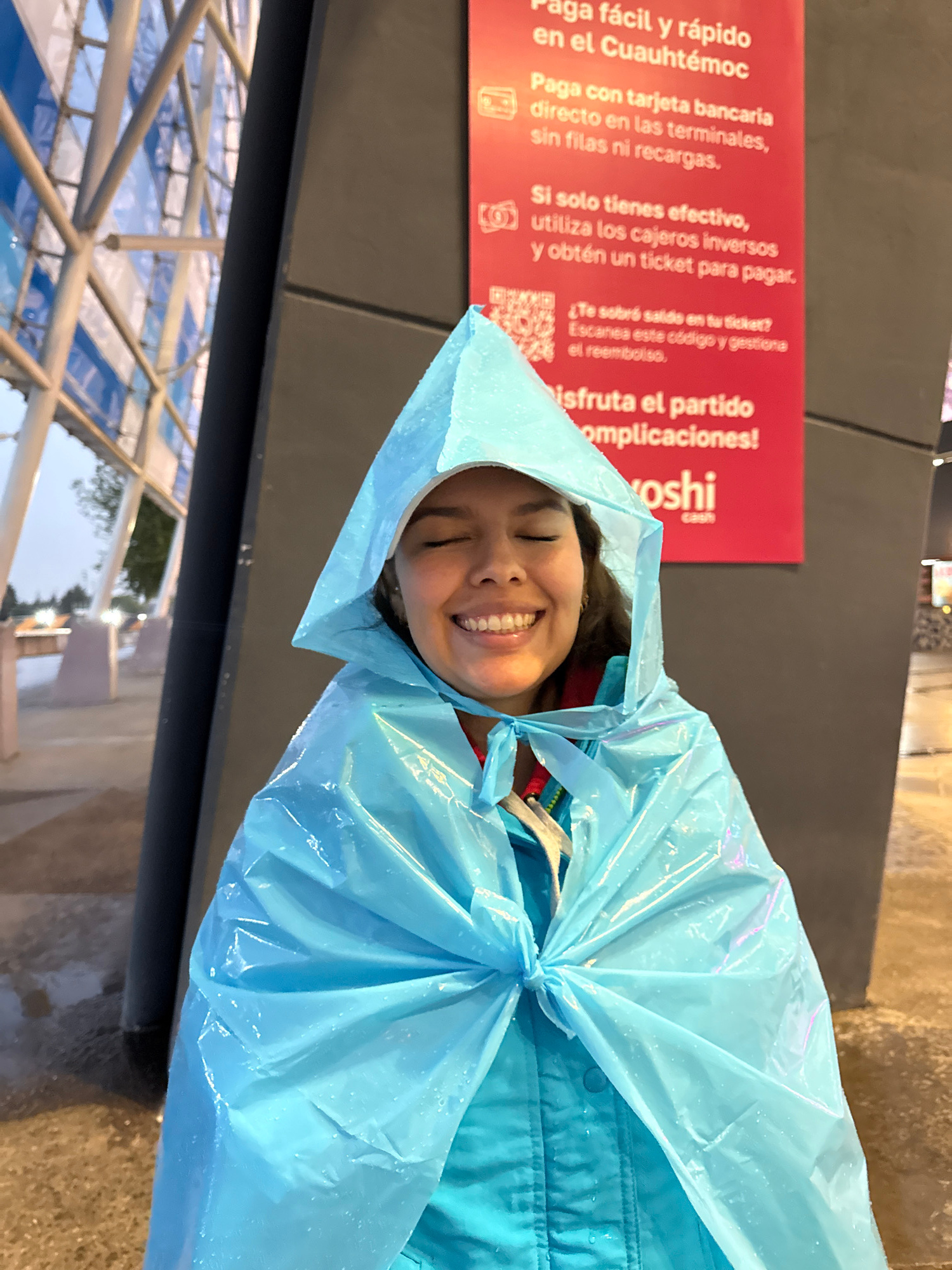 A woman wearing a blue poncho smiles at the camera. Behind her is a red sign that says "Paga fácil y rápido en el Cuauhtémoc," indicating that she is at the Estadio Cuauhtémoc in Puebla, Mexico. The s…read more