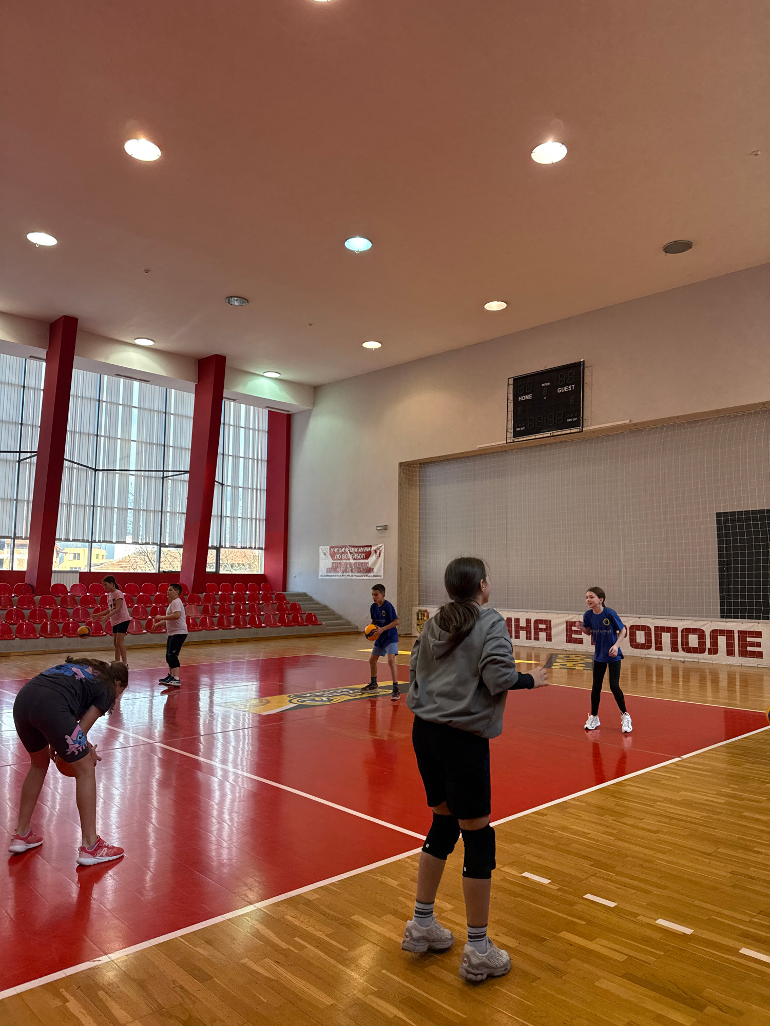 The image shows an indoor gymnasium in Etropole, Bulgaria, with a group of young people engaged in physical activity. Several individuals are present on the wooden and red-painted floor of the gym. A girl in a gray sweatshirt, black shorts, knee pads, and gray sneakers is closest to the camera. Other individuals are wearing athletic attire, and some are stretching or performing exercises. A digital scoreboard is visible on the wall, along with signage in Cyrillic. Windows run along one side of the gym, with red structural supports and rows of red seating beneath. The ceiling is white with recessed lighting. | Open Wire