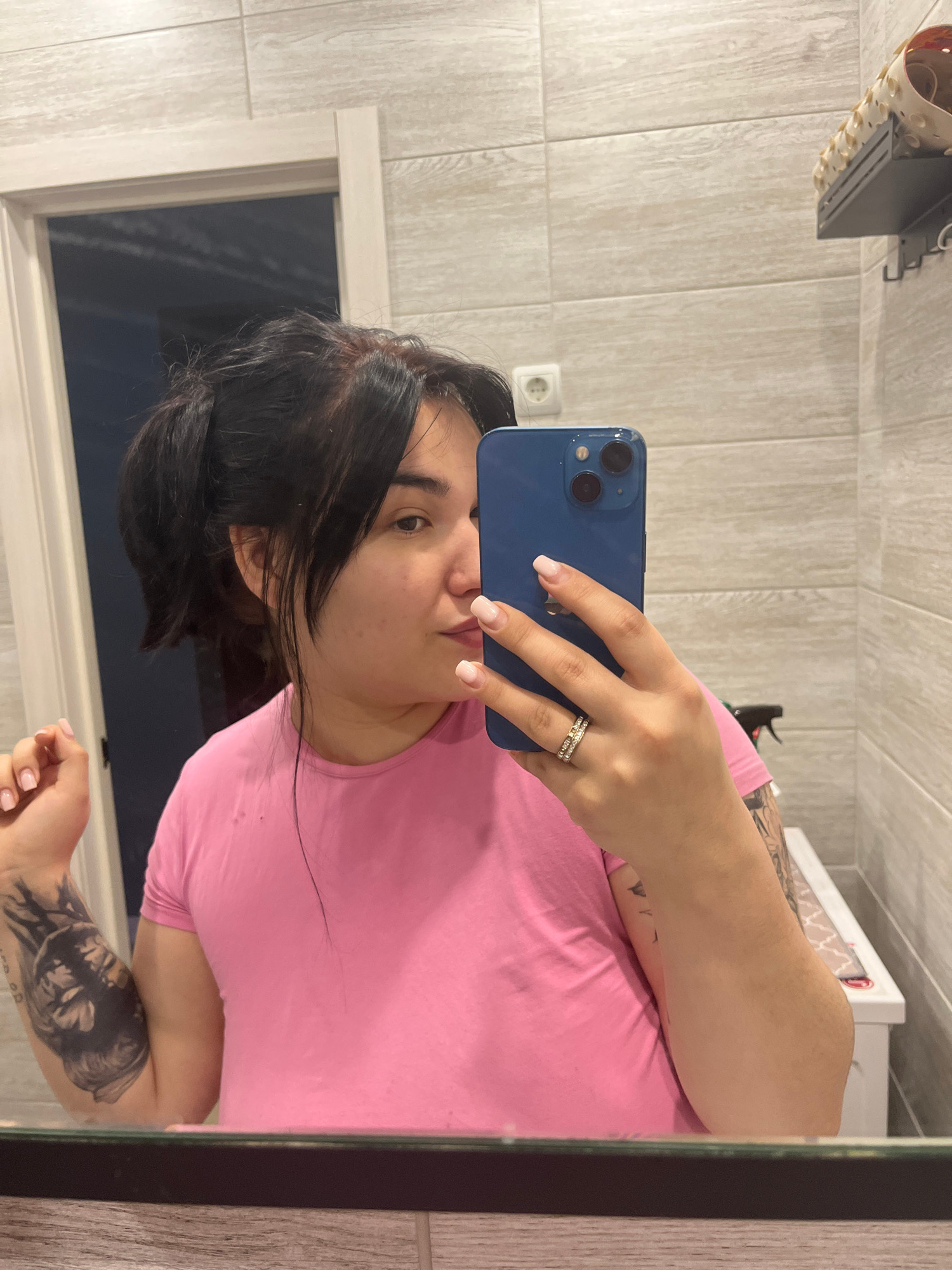 A person with dark hair is taking a selfie in a bathroom mirror. The person is wearing a pink top and holding a blue iPhone in their right hand. The bathroom has light wood-look tiled walls. A towel rack with towels is visible above. A window or dark surface is seen in the reflection behind the person. The person is wearing two rings on their ring finger and has pale pink nail polish. The person has a tattoo on their left arm. There is an electrical outlet on the wall. The location appears to be a domestic bathroom. There is no information to suggest this location is in Chaikovsky, Russia. | Open Wire