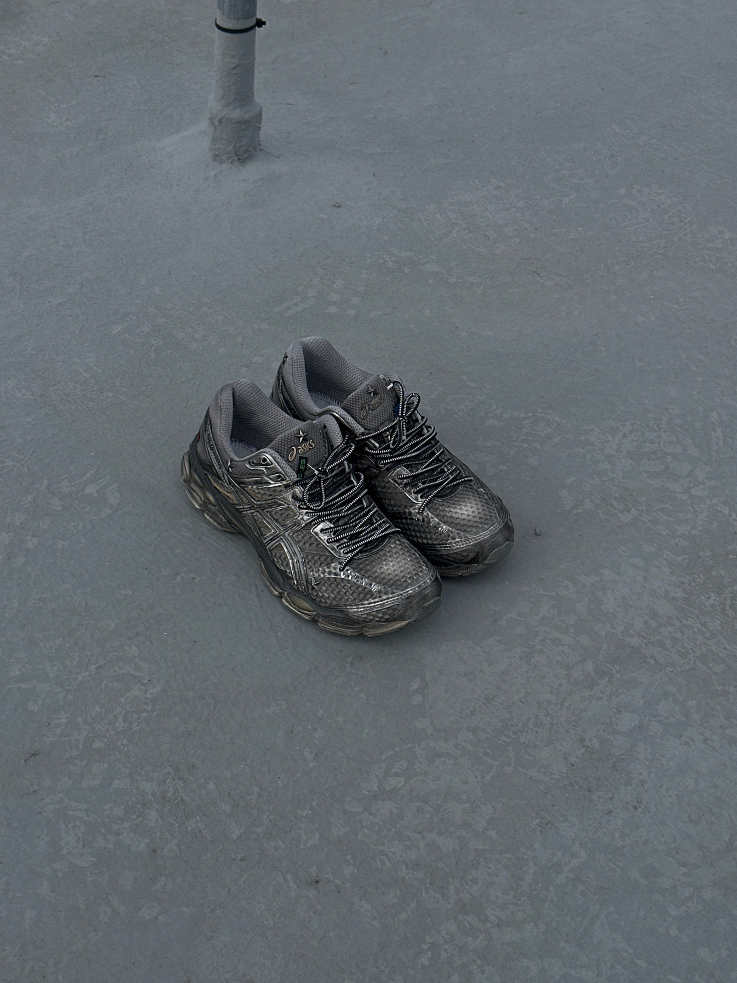 An overhead shot presents a pair of grey athletic shoes resting on a textured, mottled grey surface, resembling concrete or asphalt. The shoes are modern running sneakers, predominantly silver-grey wi…read more