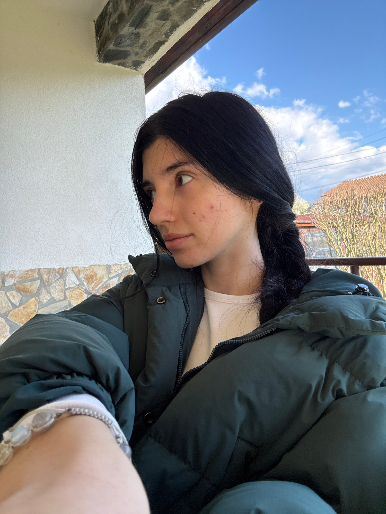 A young woman with long, dark hair is pictured outdoors, possibly in the town of Chavdar, Bulgaria. She is wearing a puffy green jacket and a white shirt underneath. The background includes a partly c…read more