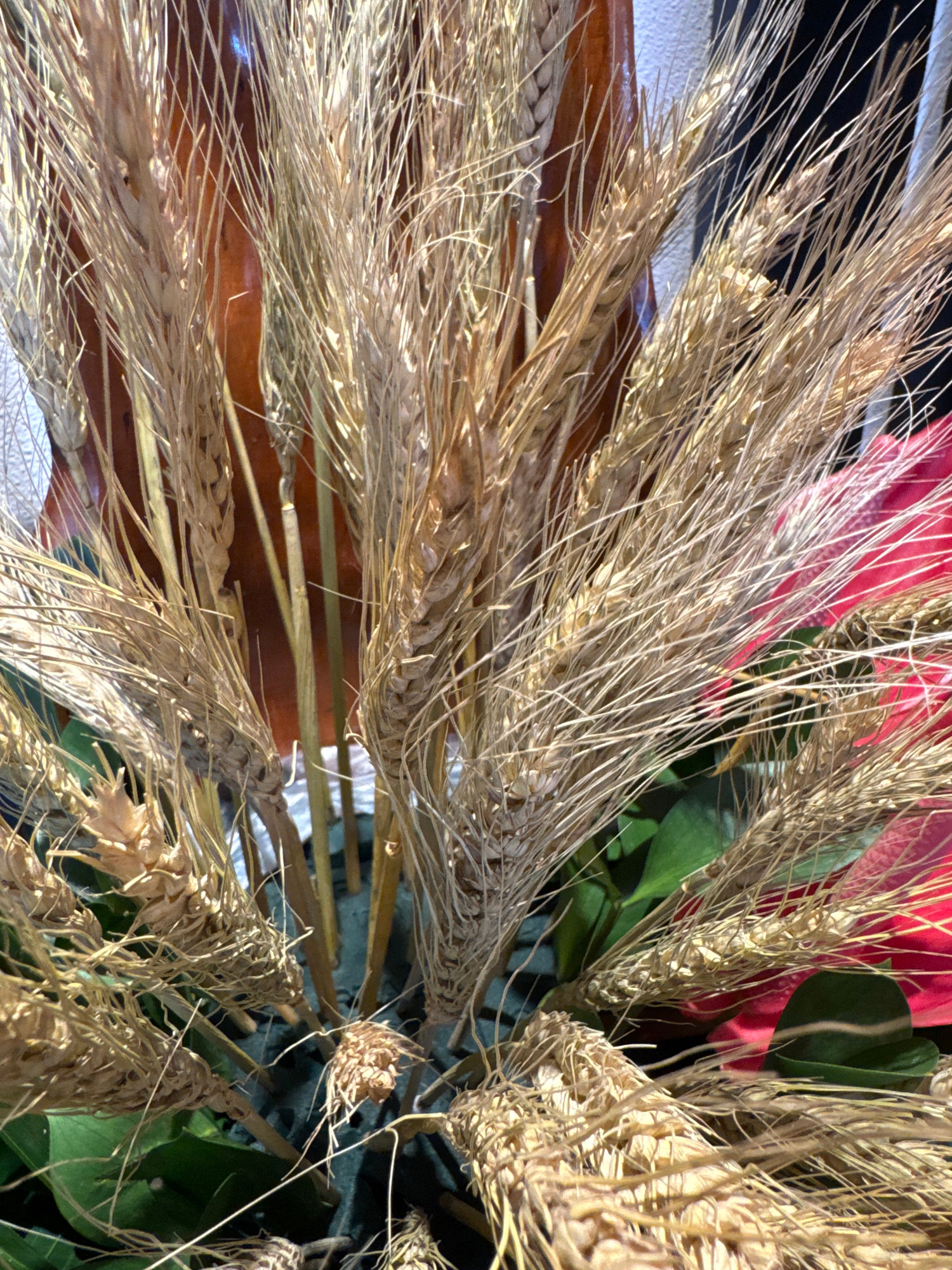 The image depicts a close-up, overhead shot of a floral arrangement or bouquet. The arrangement consists primarily of dried wheat stalks, with some green leaves and hints of red flowers visible amongs…read more