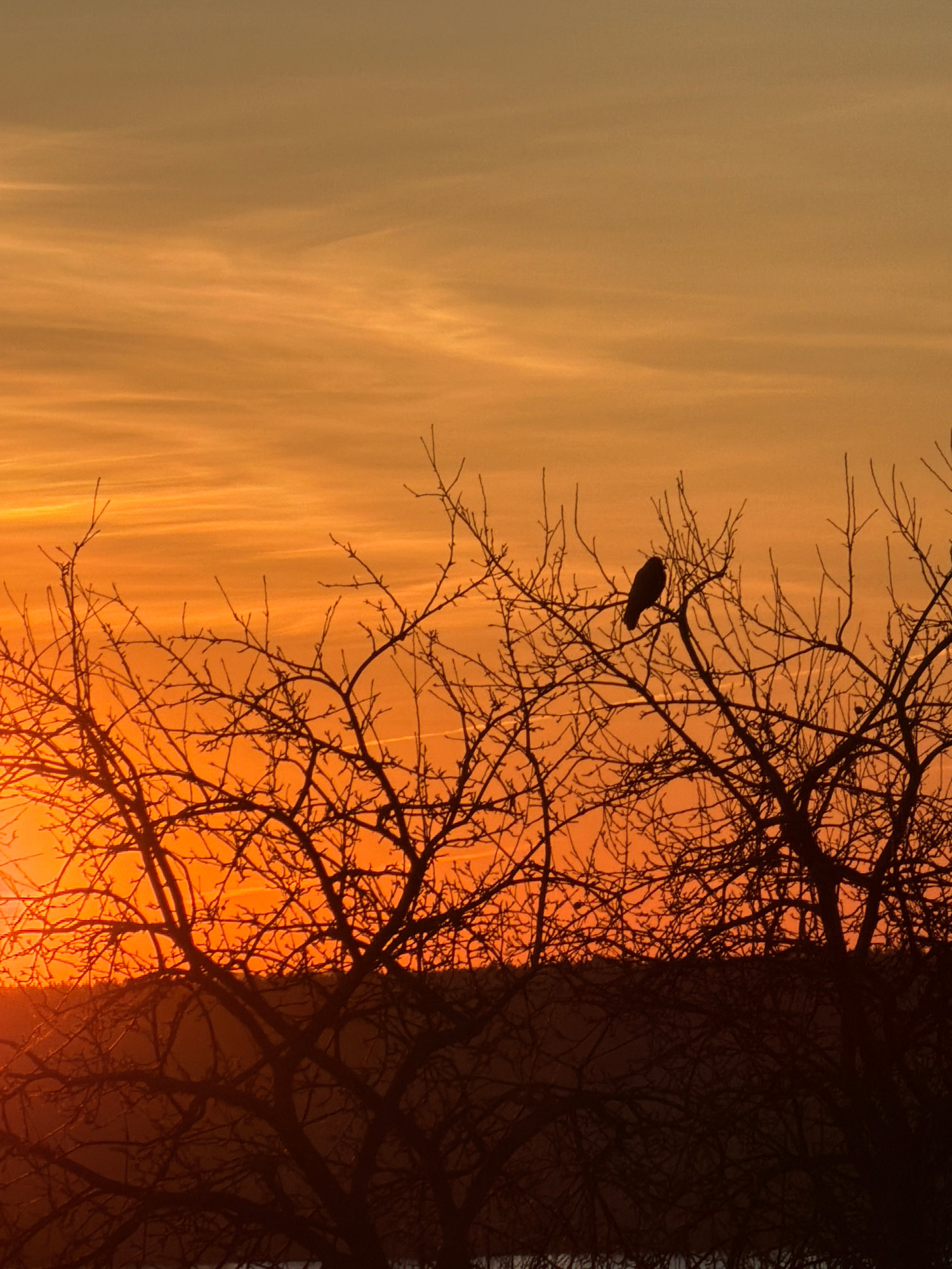 The image shows a silhouette of a tree with bare branches against a sunset sky. A bird is perched on one of the branches. The light of the sunset is diffused and golden, with some faint clouds visibleβ¦read more