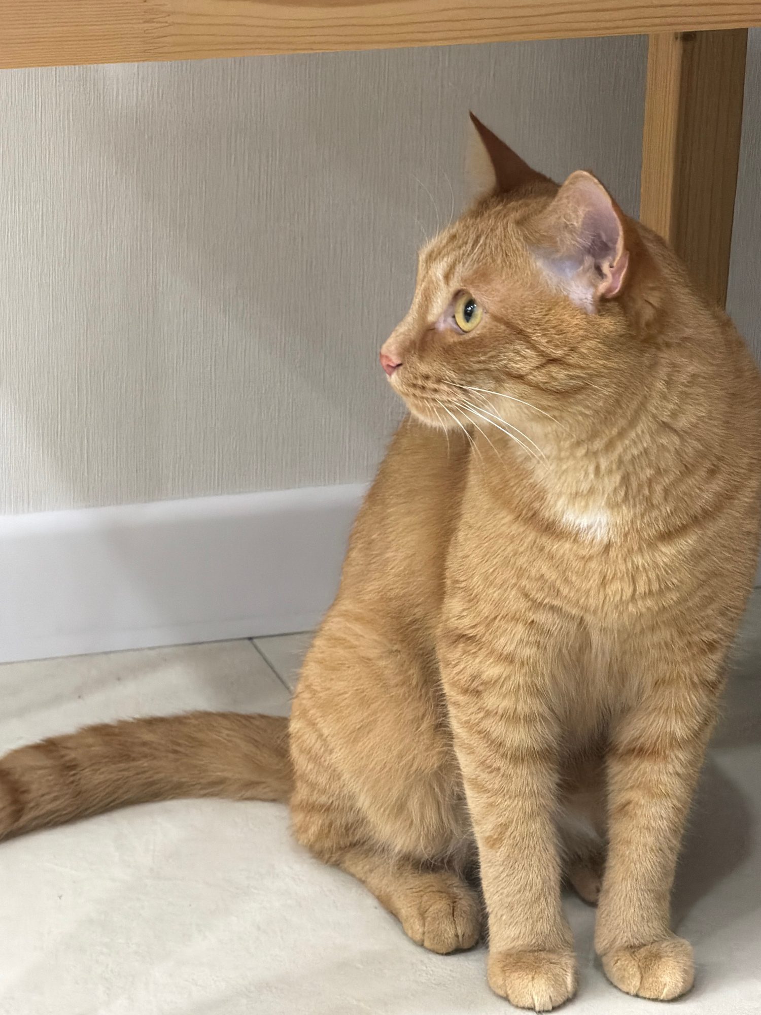An orange tabby cat is crouched on a white tiled floor, with its body angled downward. The cat's tail extends downward towards the bottom of the image. A light wood-colored object, possibly part of fu…read more