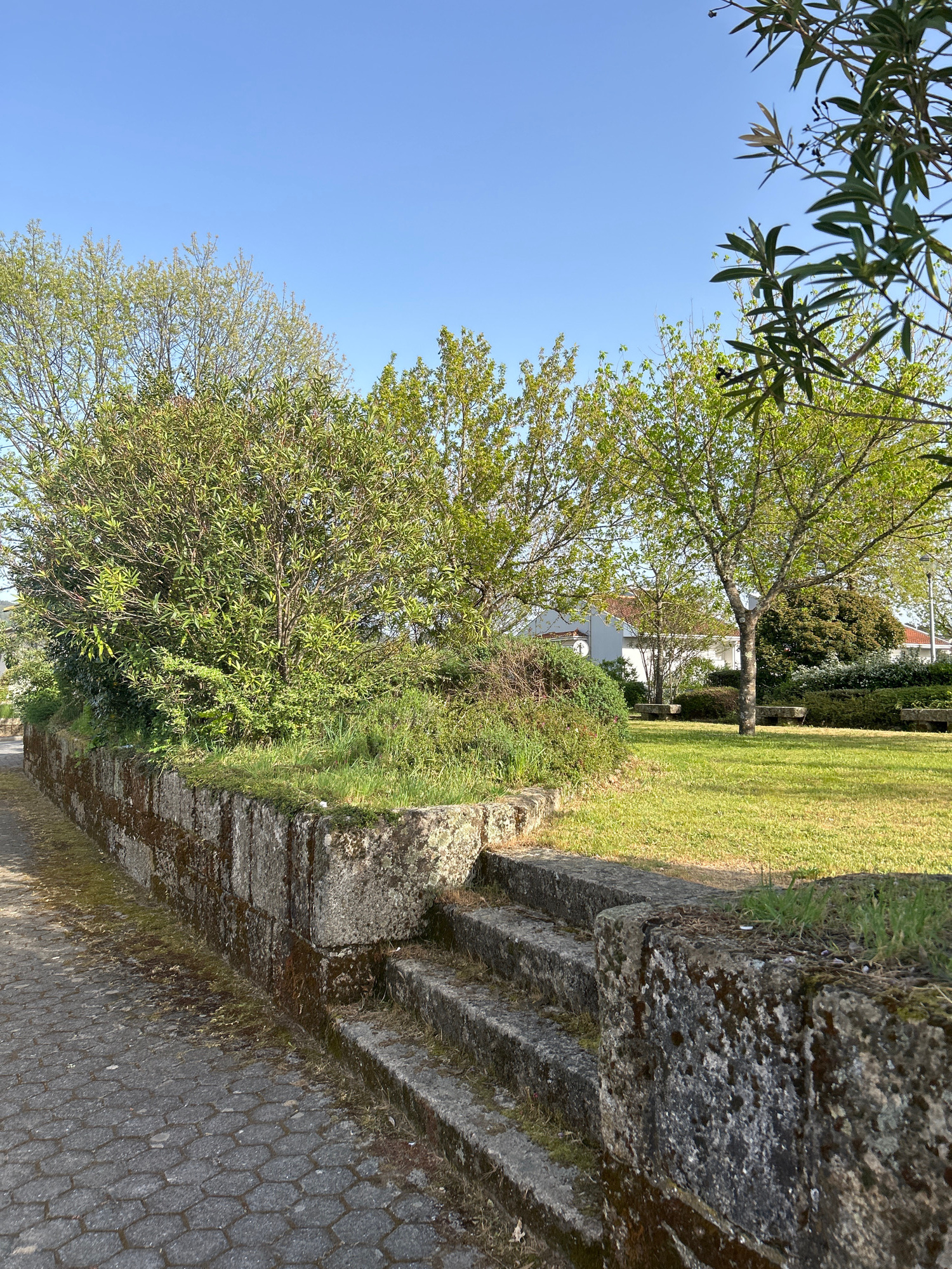 The scene shows a sideways view of a residential area on a sunny day. A paved path, composed of hexagonal blocks, runs along the bottom of the frame, bordered by a low stone wall or embankment covered…read more