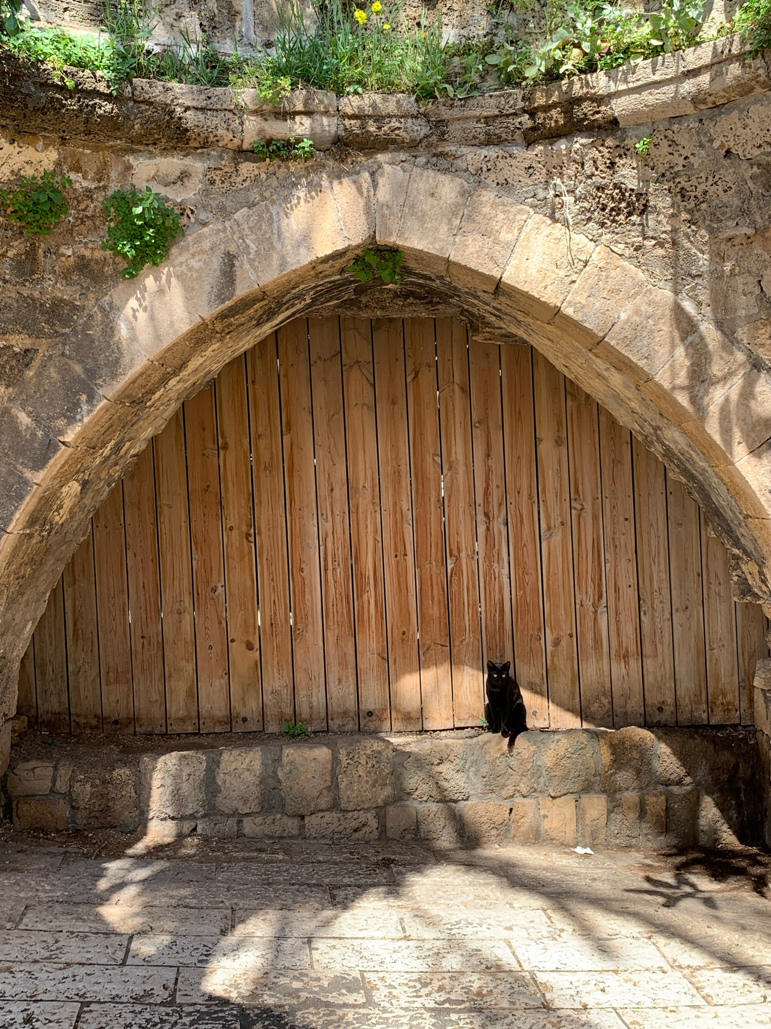 A wooden door is set into a stone archway. A black cat lies on the right side of the doorway. The archway is constructed of light-colored stone. Green foliage grows on the left side of the archway. Tr…read more