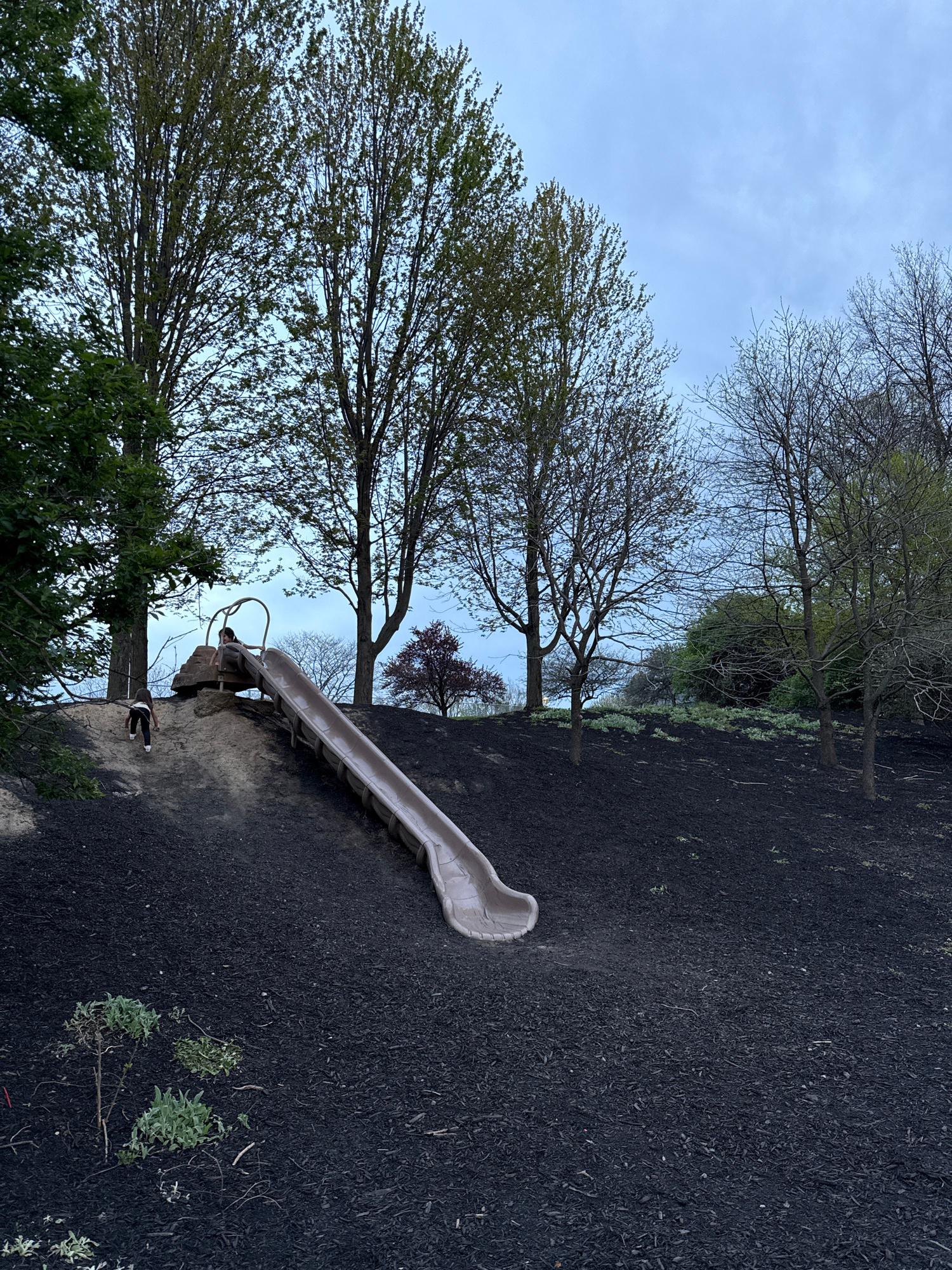 The image depicts an outdoor playground in Grove City, Ohio, United States of America. A tan slide is situated on a hill covered in dark mulch. Trees with budding leaves surround the play area. Two pe…read more