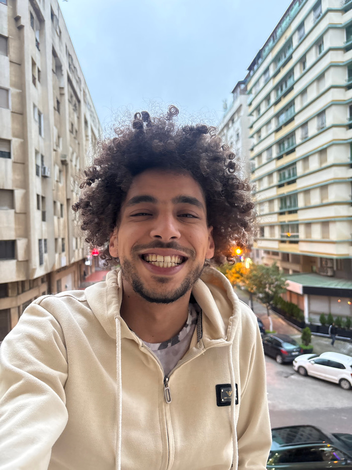 A man with curly hair and a light beard smiles at the camera. He is wearing a light-colored hoodie. Tall buildings line the street behind him, with some cars visible in the distance. The photo is take…read more