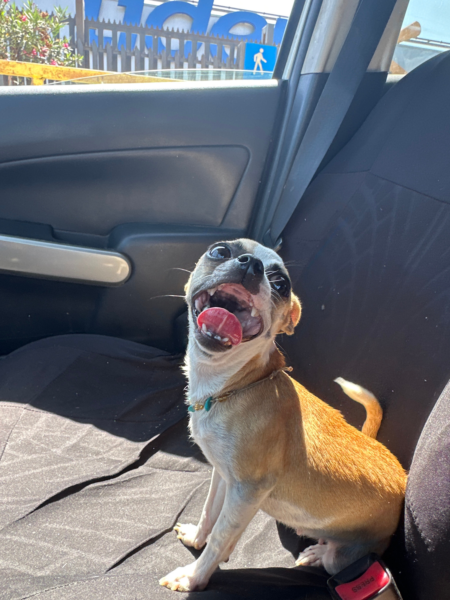 A small, tan and white Chihuahua dog is lying on a dark-colored car seat. The dog has its mouth open, revealing its pink tongue. It wears a turquoise beaded collar. To the left of the dog, part of theβ¦read more