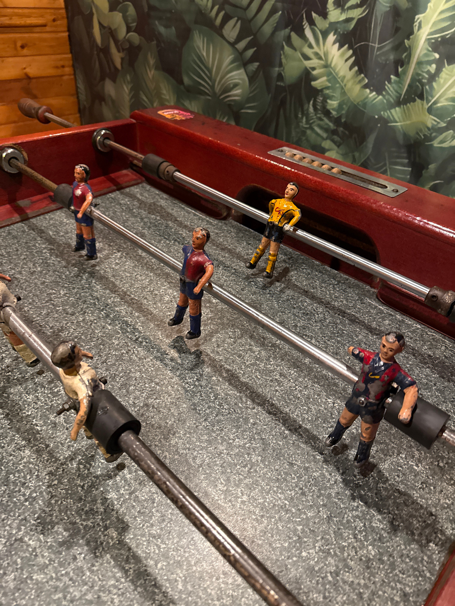 The image shows a close-up of a foosball table. The table is red with chrome rods that hold small, painted soccer player figures. The figures wear different colored jerseys. The playing surface is gra…read more