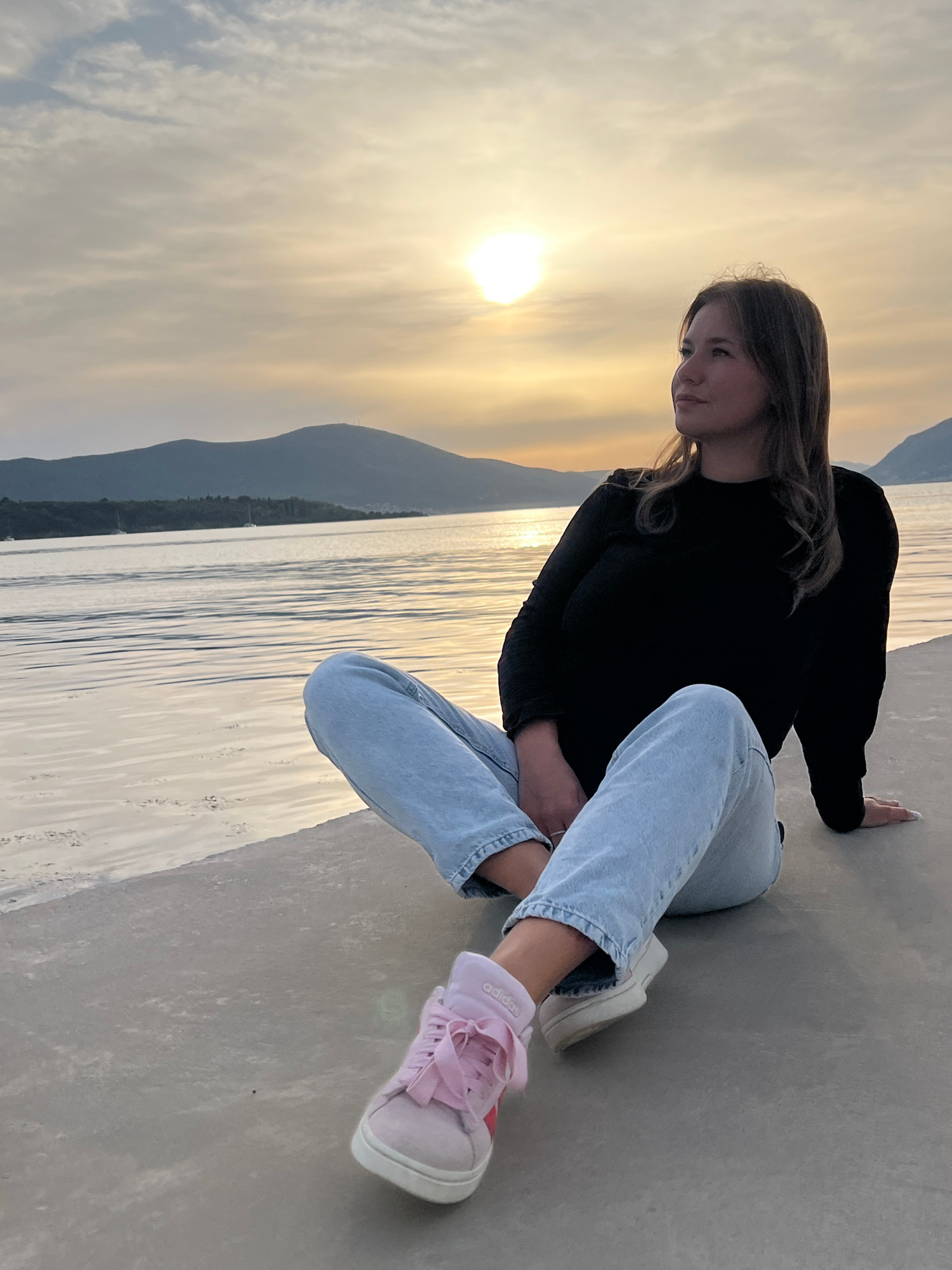 The image shows a young woman sitting on a concrete surface near the water in Tivat, Montenegro. She is wearing a black long-sleeved shirt, light blue jeans, and pink Adidas sneakers. She is looking t…read more