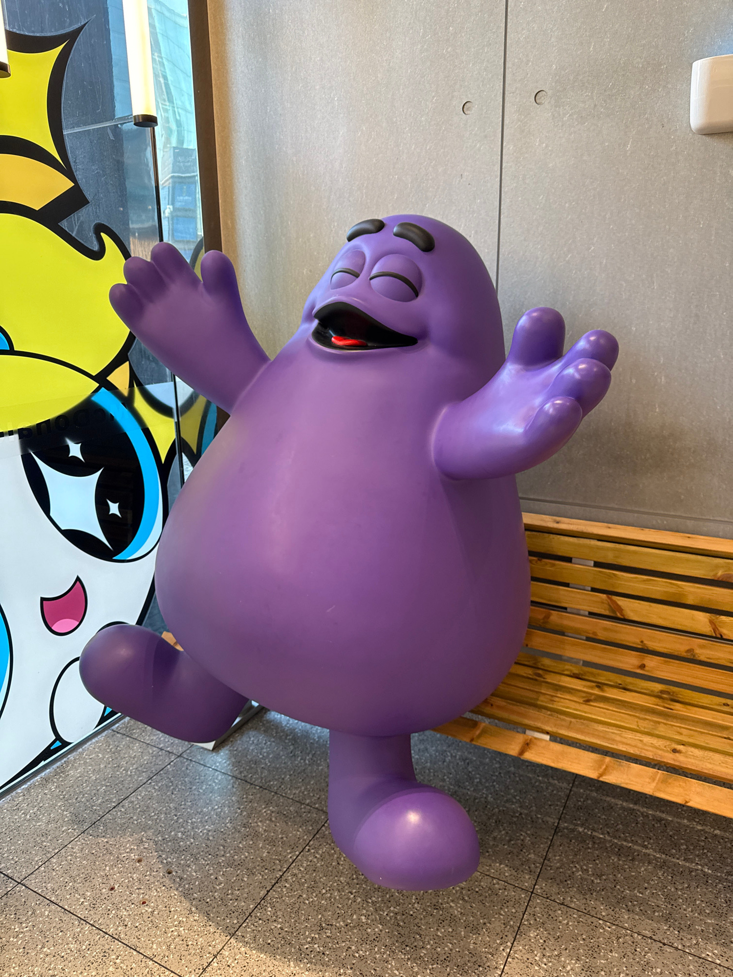 The image shows a purple, cartoonish figure with multiple eyes and an open mouth, posed with raised arms and a tail-like appendage. It appears to be a sculpture or statue and is standing on a surface…read more