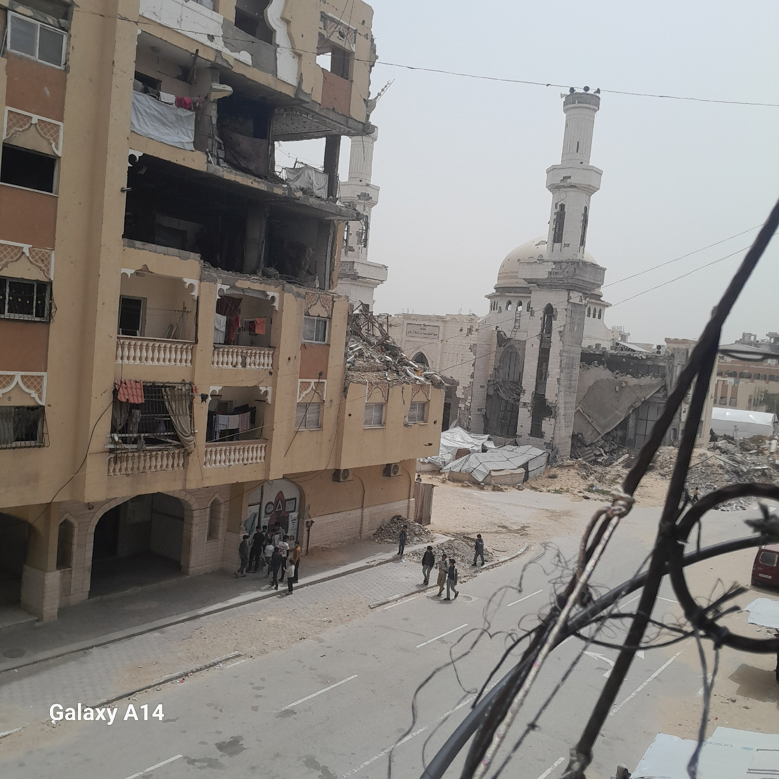 This media file depicts a heavily damaged urban landscape in Khan Yunis, Palestinian Territory. The scene is dominated by severely damaged buildings and a street littered with rubble. In the foregrou…read more